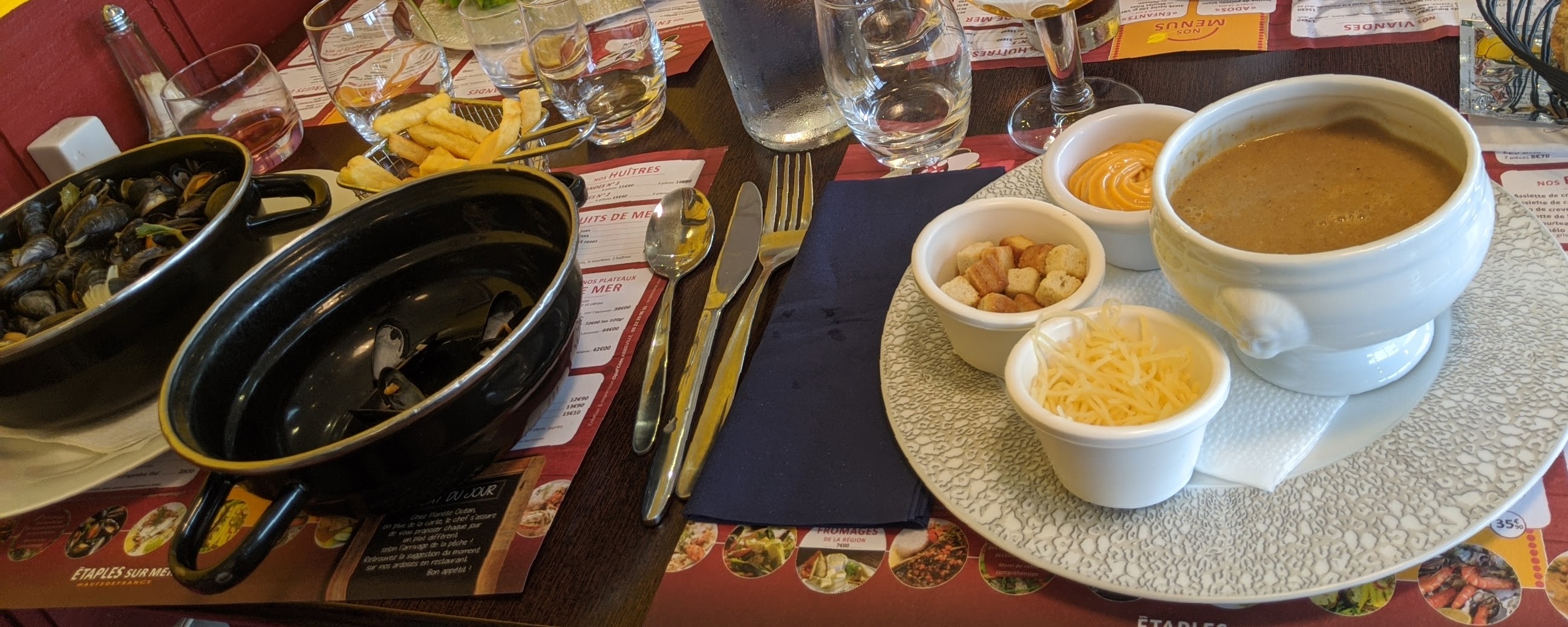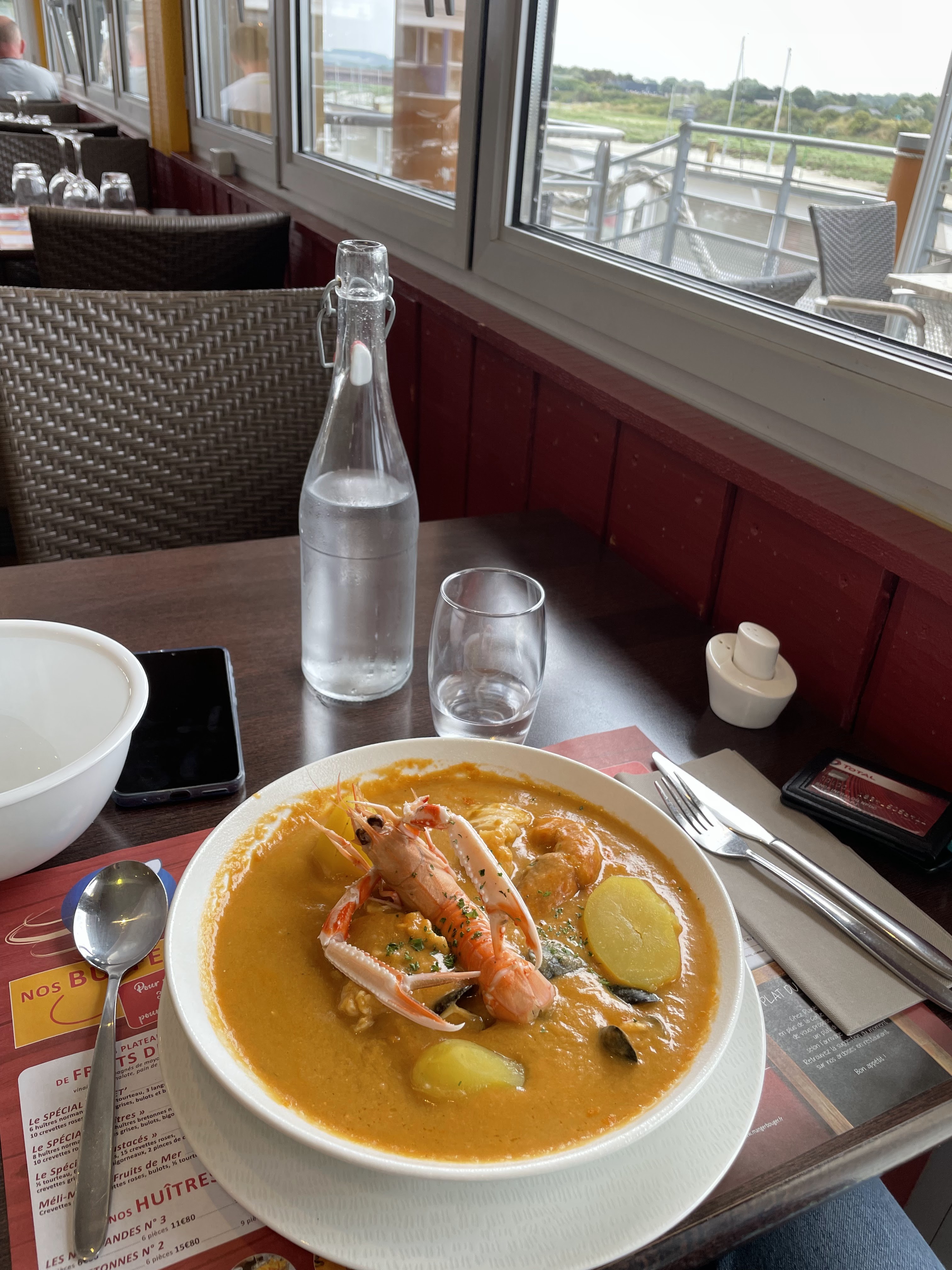 Bonne expérience. Service convivial et rapide. On s'occupe bien de vous. Excellente moules marinières (avec un véritable goût. Célerie, Laurier,oignons etc.) des frites fraîches délicieuses en accompagnement. 12€90 Bon vin blanc (muscade) Ambiance Marine avec vue panoramique le port d'Etaples. Je recommande vivement ce bel établissement. Prix plus que correct. Photos.. Je n'ai pas pris de photos des moules marinières mais d'une belle bouillabaisse qui y était servie.