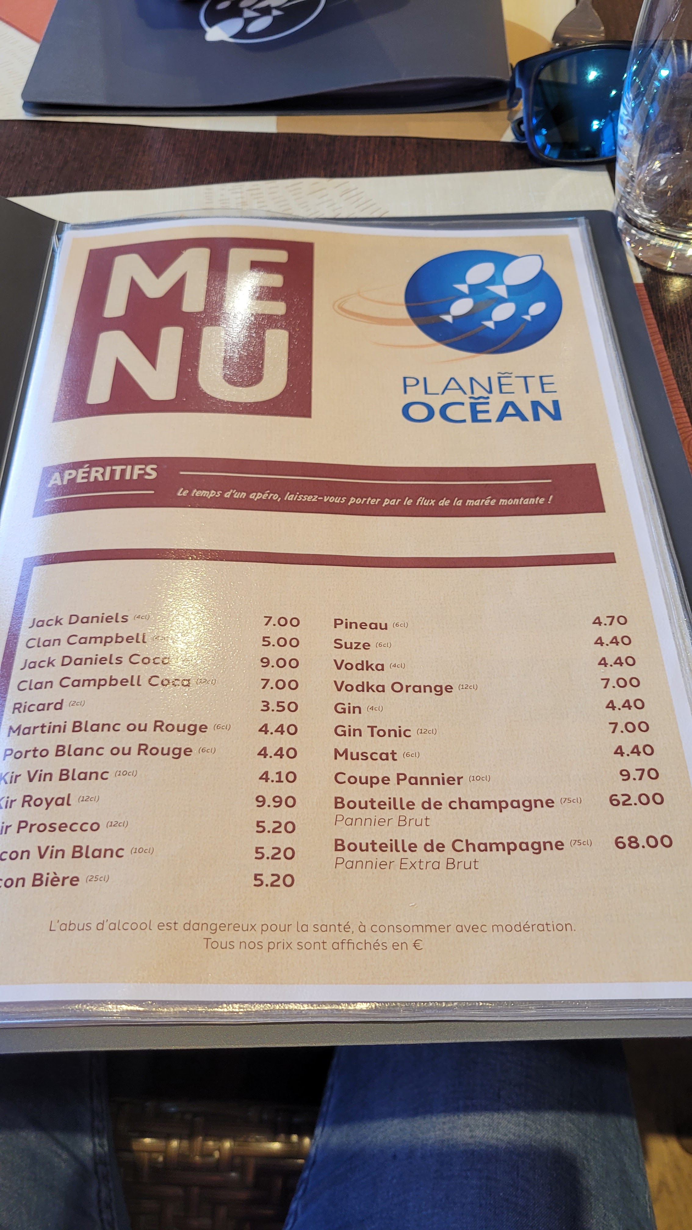 Nous recherchions un restaurant qui accueille les chiens, nous nous dirigeons donc vers Planète Océan après avoir consulté le guide de l'Office de tourisme. Étant le jour de la rentrée, nous sommes arrivés sans réserver. Malheureusement les serveurs nous ont expliqué qu'ils sont en sous-effectifs, et ne peuvent pas nous accueillir avant le prochain service 1h plus tard. On réserve donc notre table cette fois et partons nous balader en attendant. À notre retour, nous sommes attablés, et mangeons bien richement avec un serveur bien sympathique. Les portions sont généreuses, il manquait un peu d'assaisonnement à nos moules mais ça c'est notre goût personnel. Nous avons payés 104€ à trois comprenant apéritifs, tapas, moules frites, desserts et boissons. Chiens bienvenus. Il faut prendre des escaliers pour monter au restaurant mais il y a également un ascenseur.