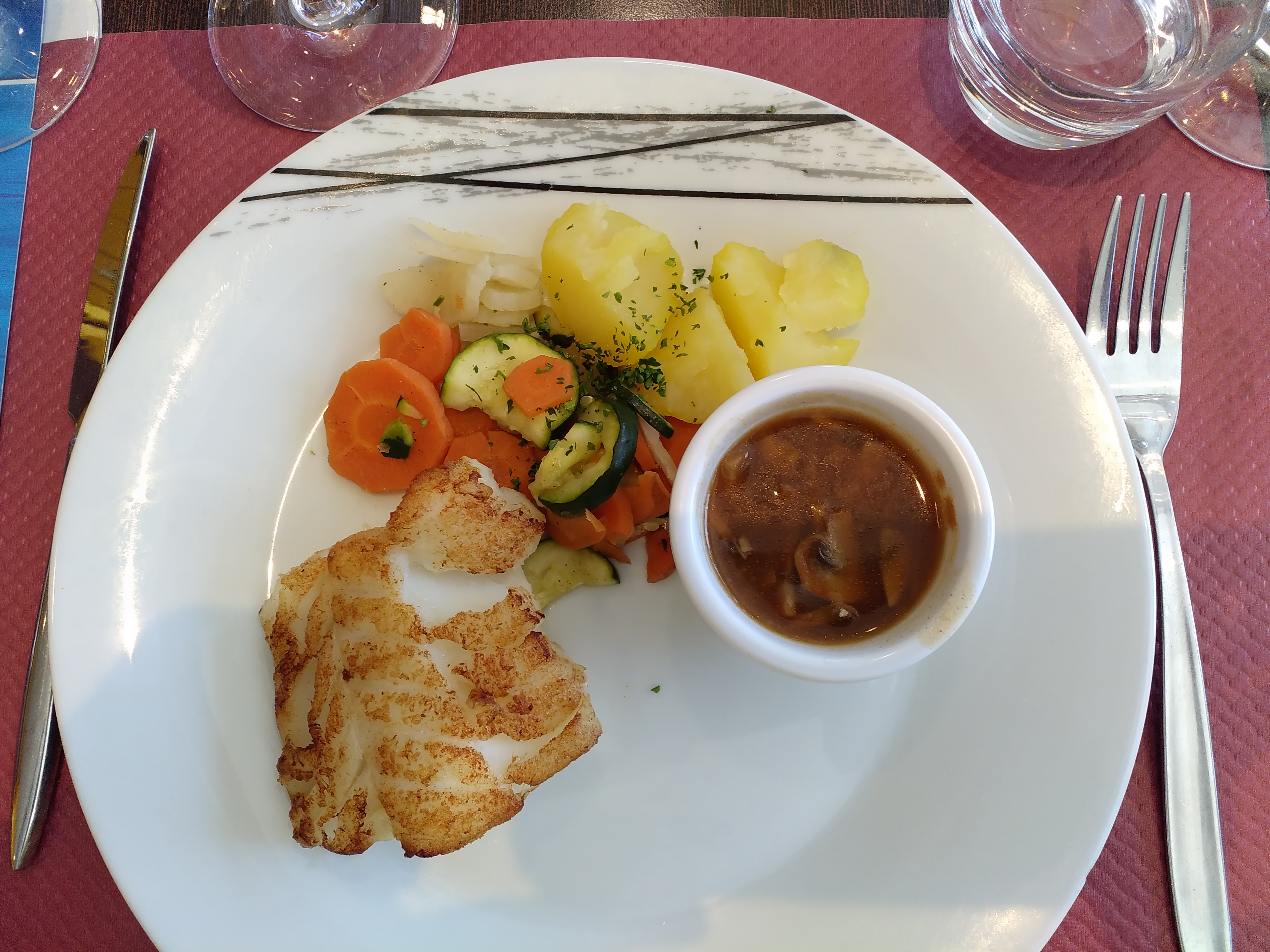 Bon menu matelot aujourd'hui pour 15€ avec un filet de merlu crème de laitue (excellent) pomme vapeur et la crème brûlé praliné pour finir !!