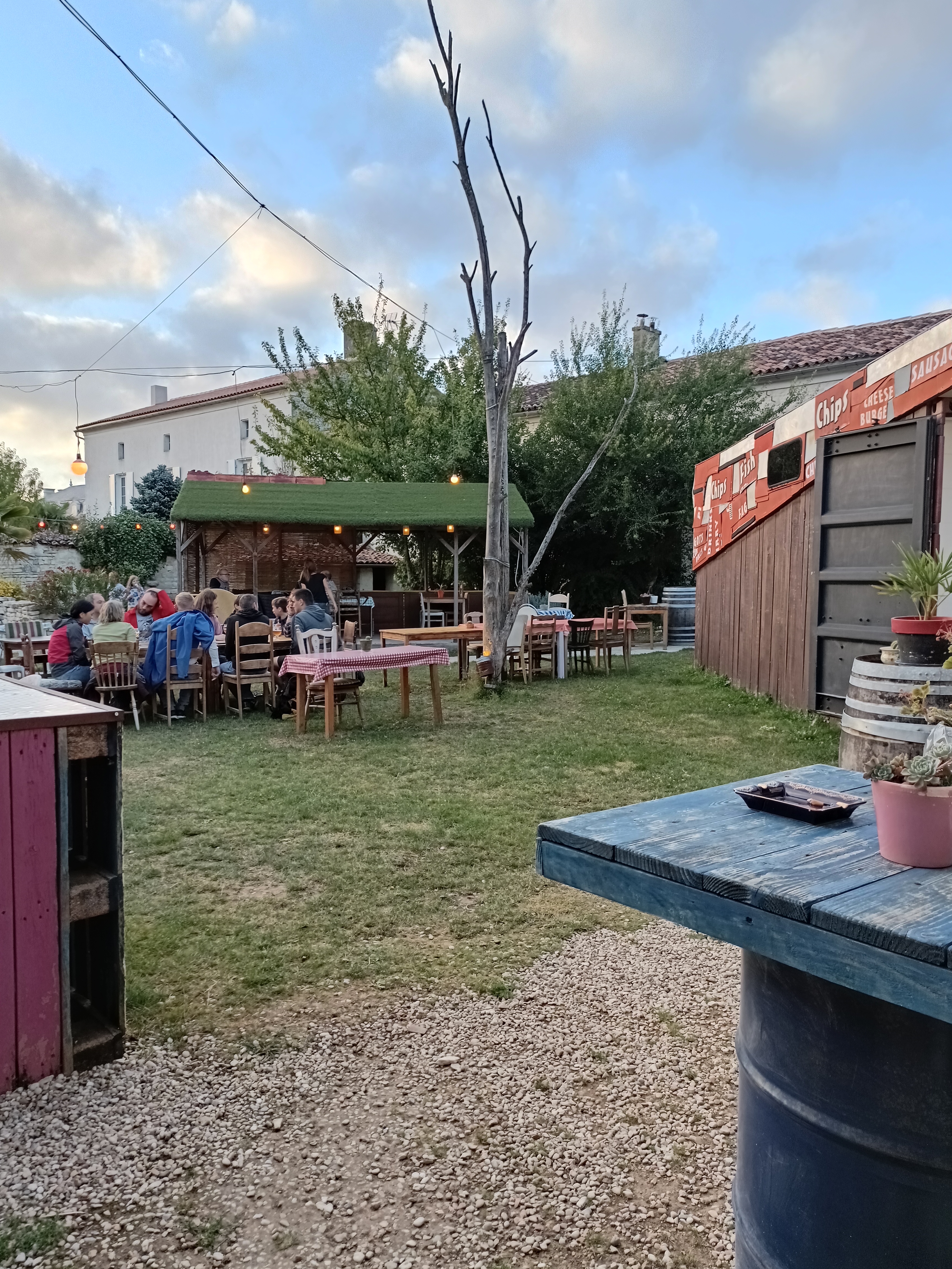 Quel endroit magnifique et spécial - une cuisine simple mais délicieuse - des frites incroyables en particulier - et une merveilleuse ambiance conviviale avec des familles, des groupes d'amis, des gens de tous âges, des enfants qui jouent, de la musique, des banderoles et des guirlandes lumineuses. Nous l'avons aimé.