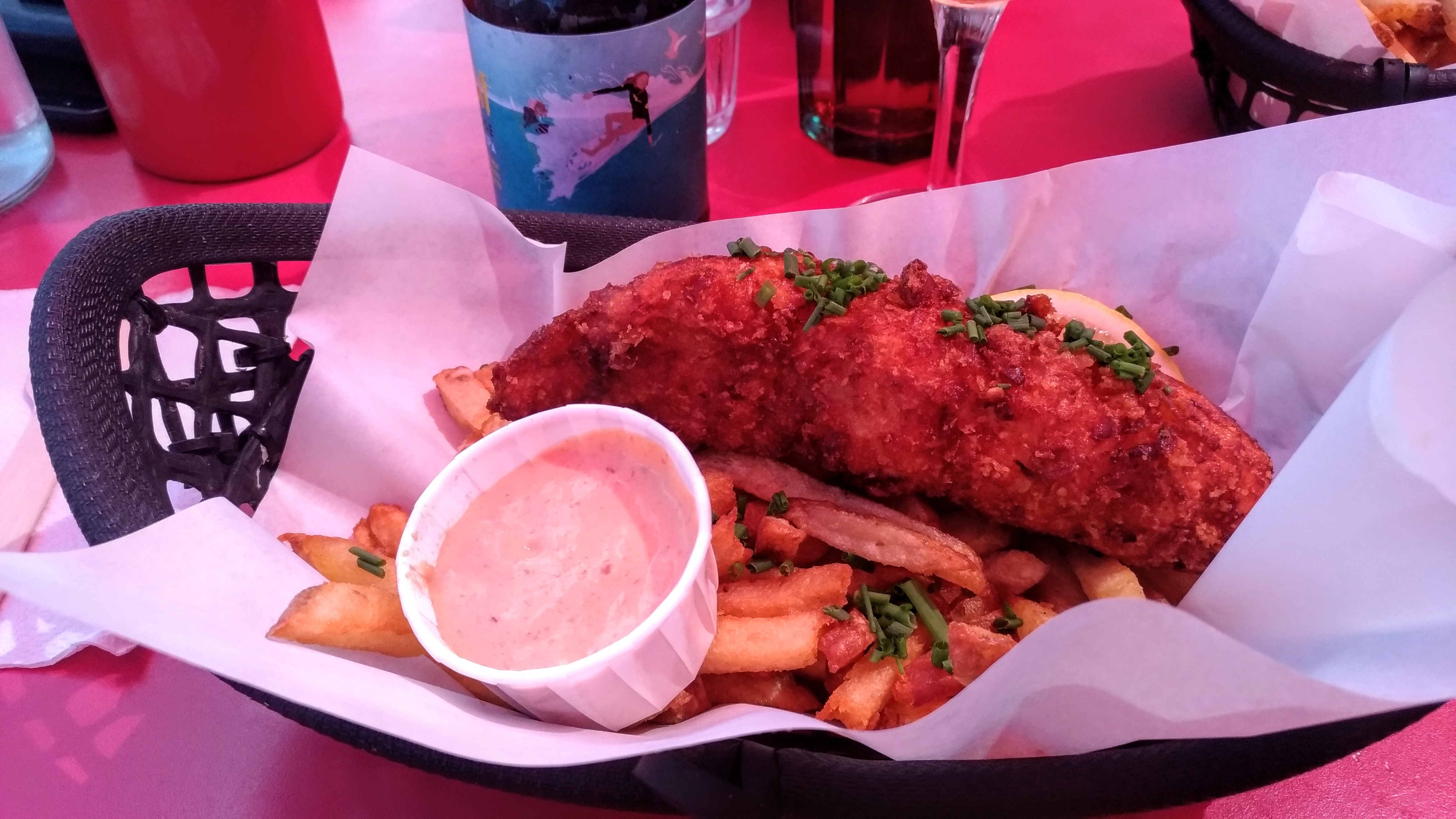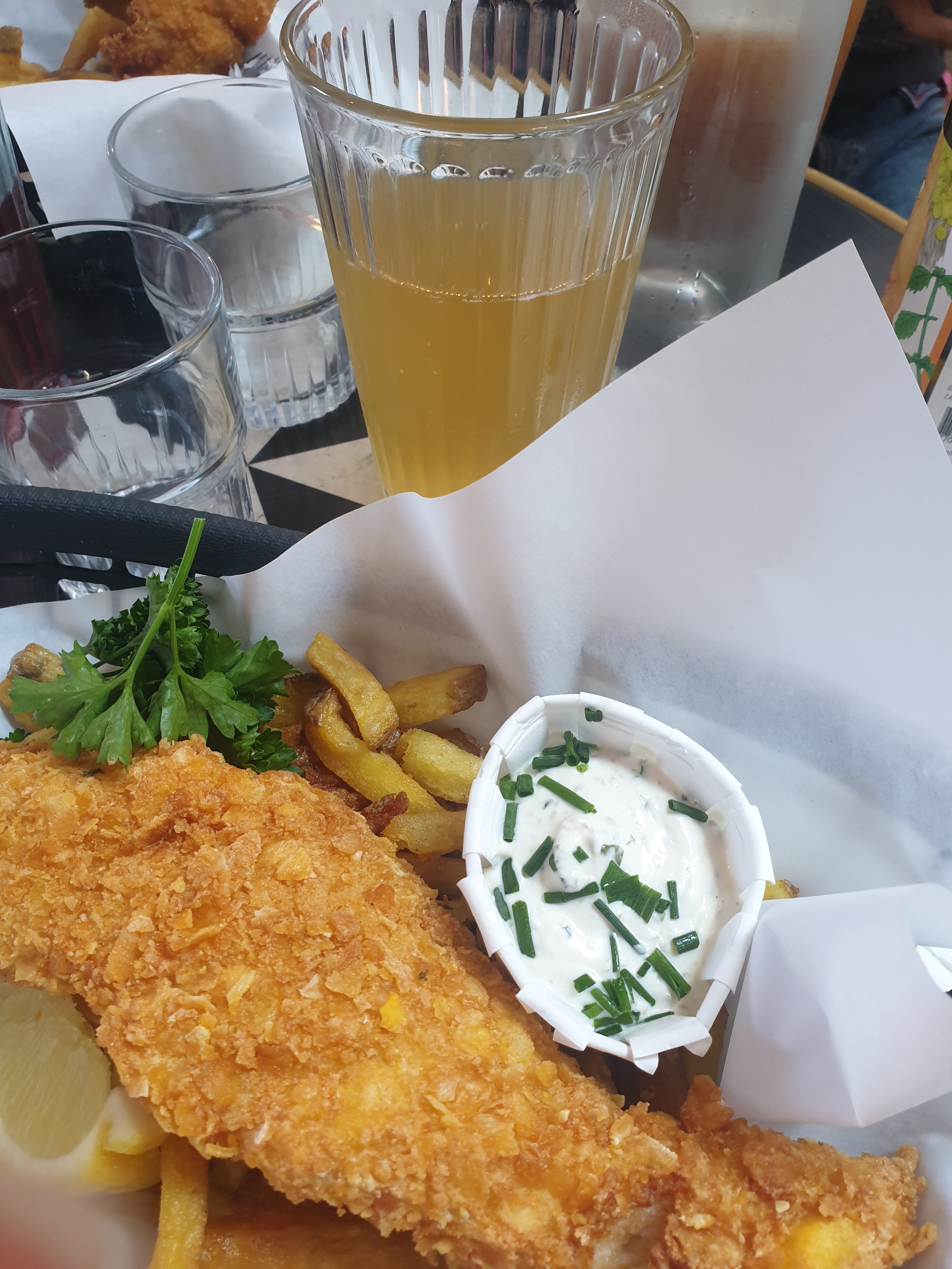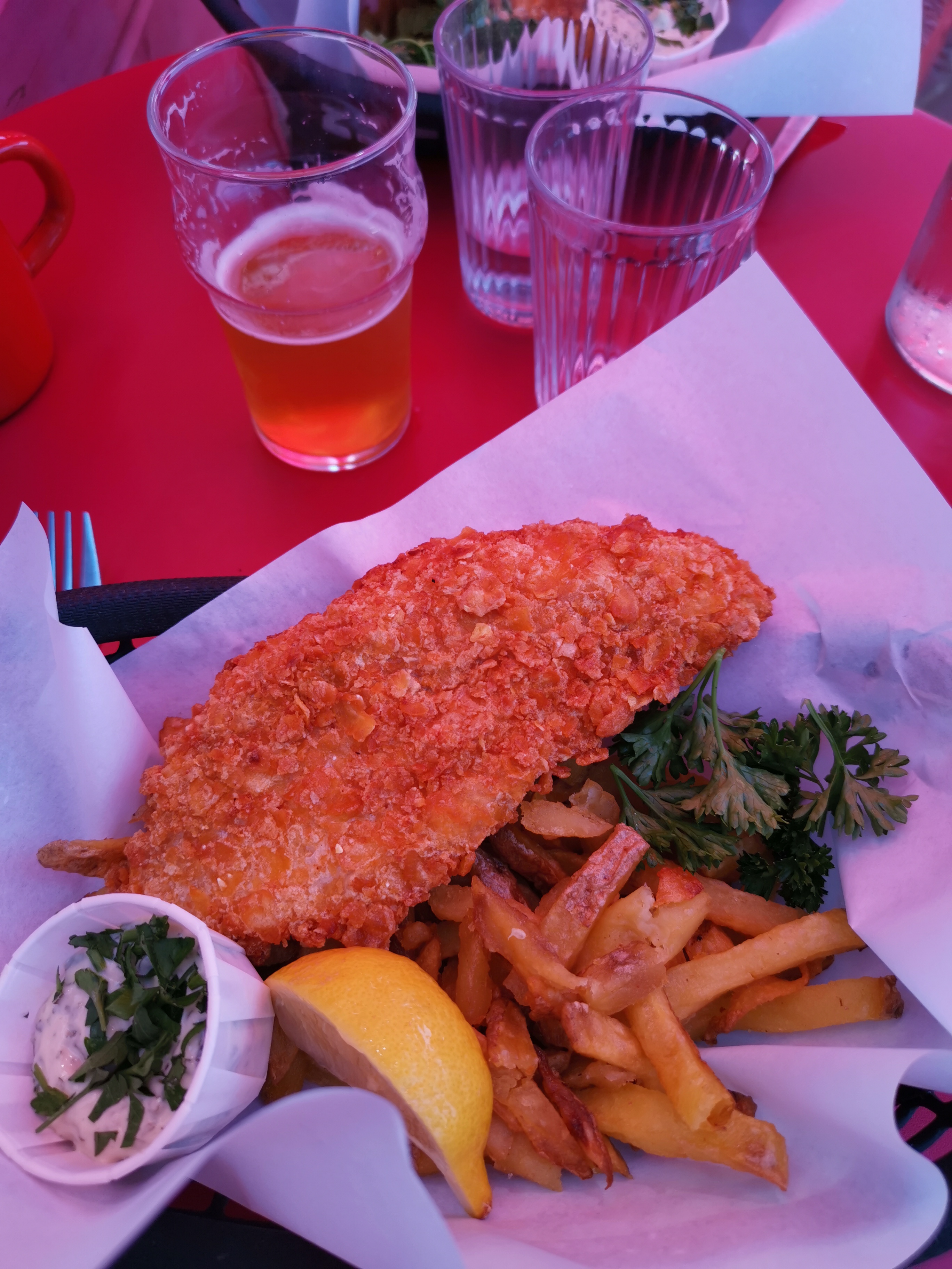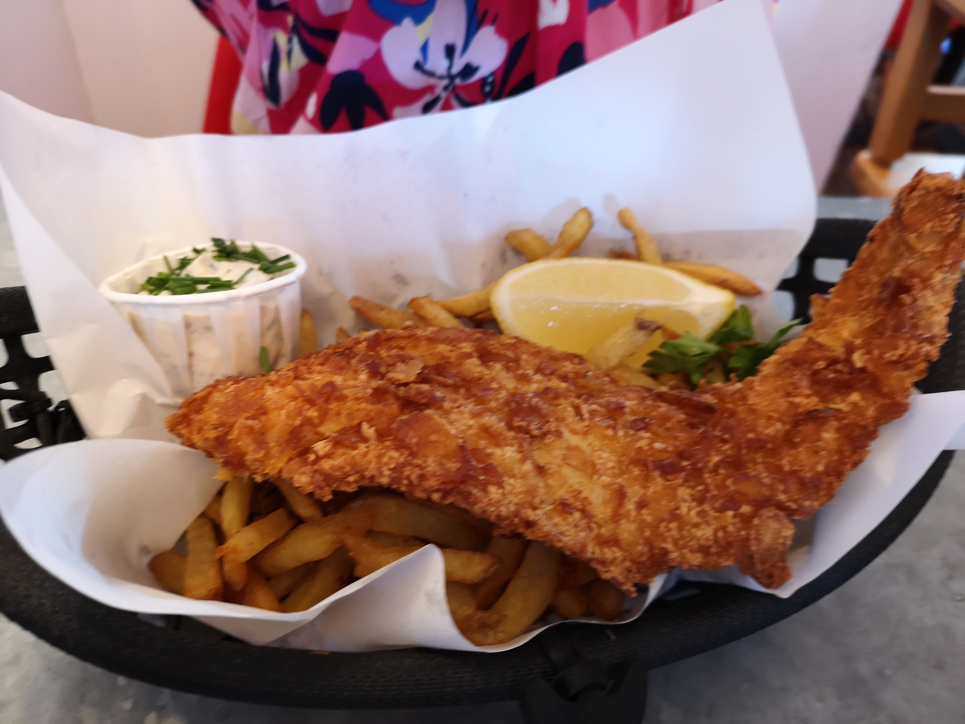 Délicieux fish and chips ! si vous voulez manger à l'intérieur je vous conseil de réserver. Nous avons pris à emporté et mangé le long des cabanes colorées c'était aussi bien :) On peut choisir sa panure et les sauces sont maison ! Un régale.