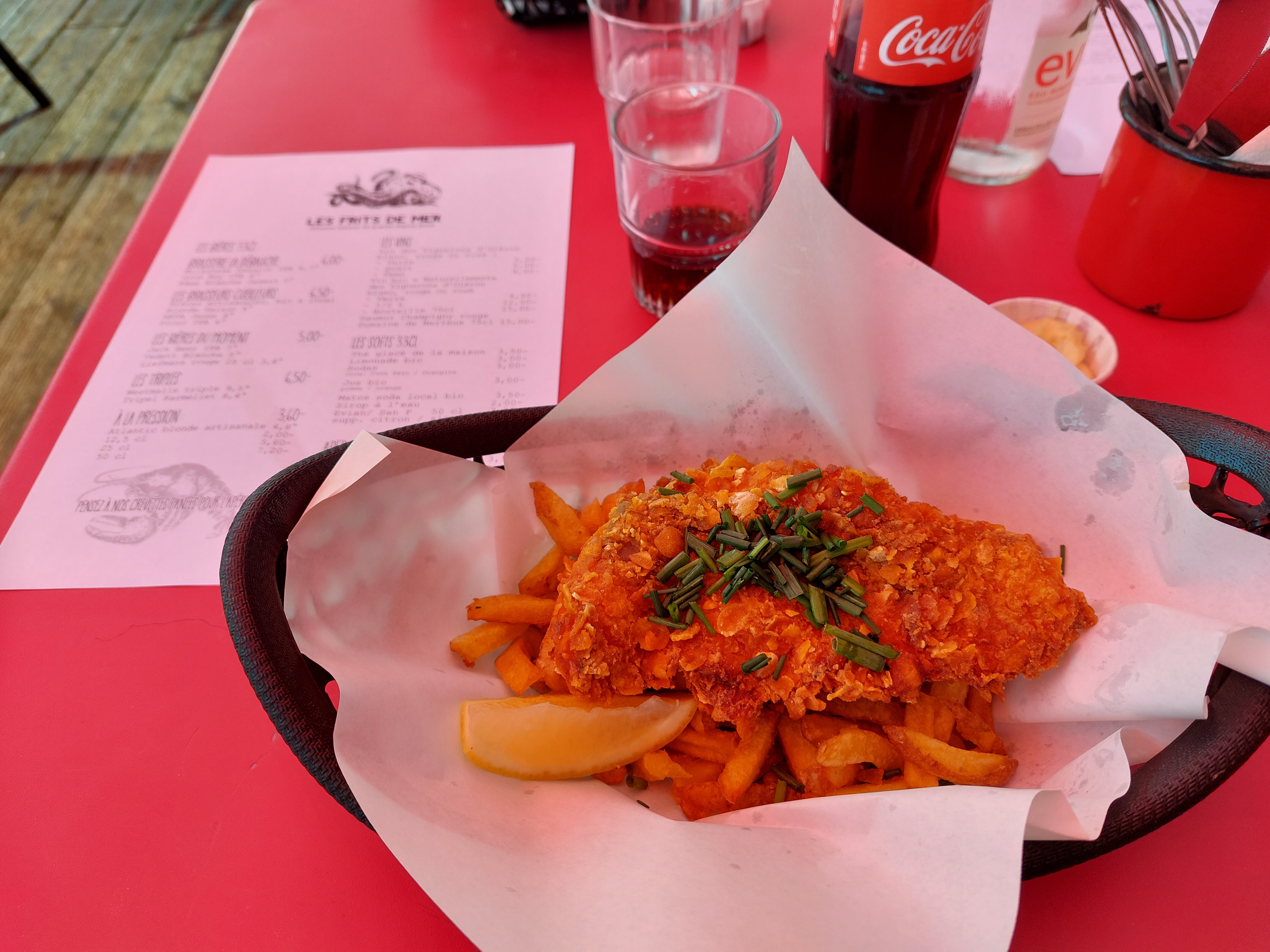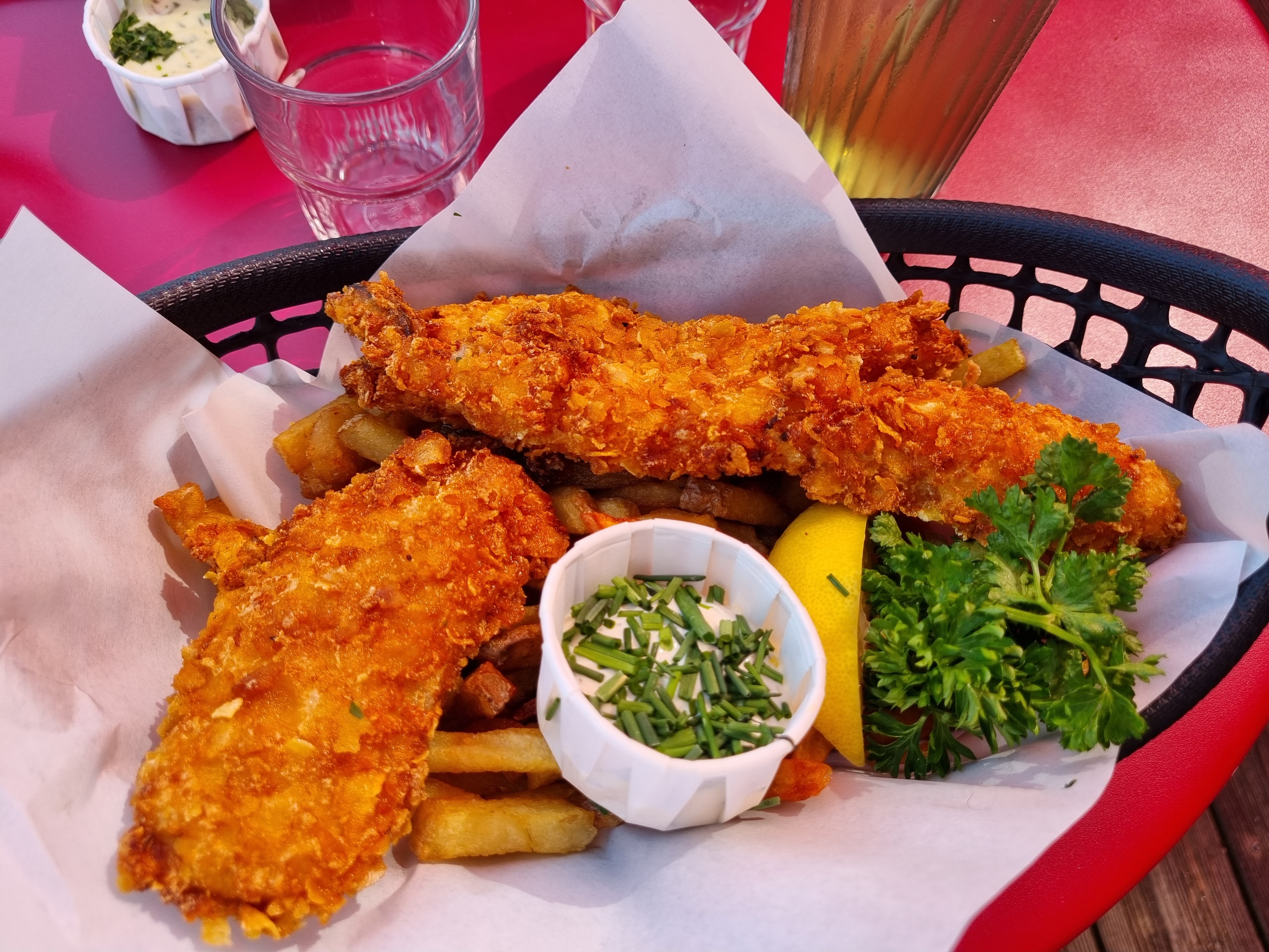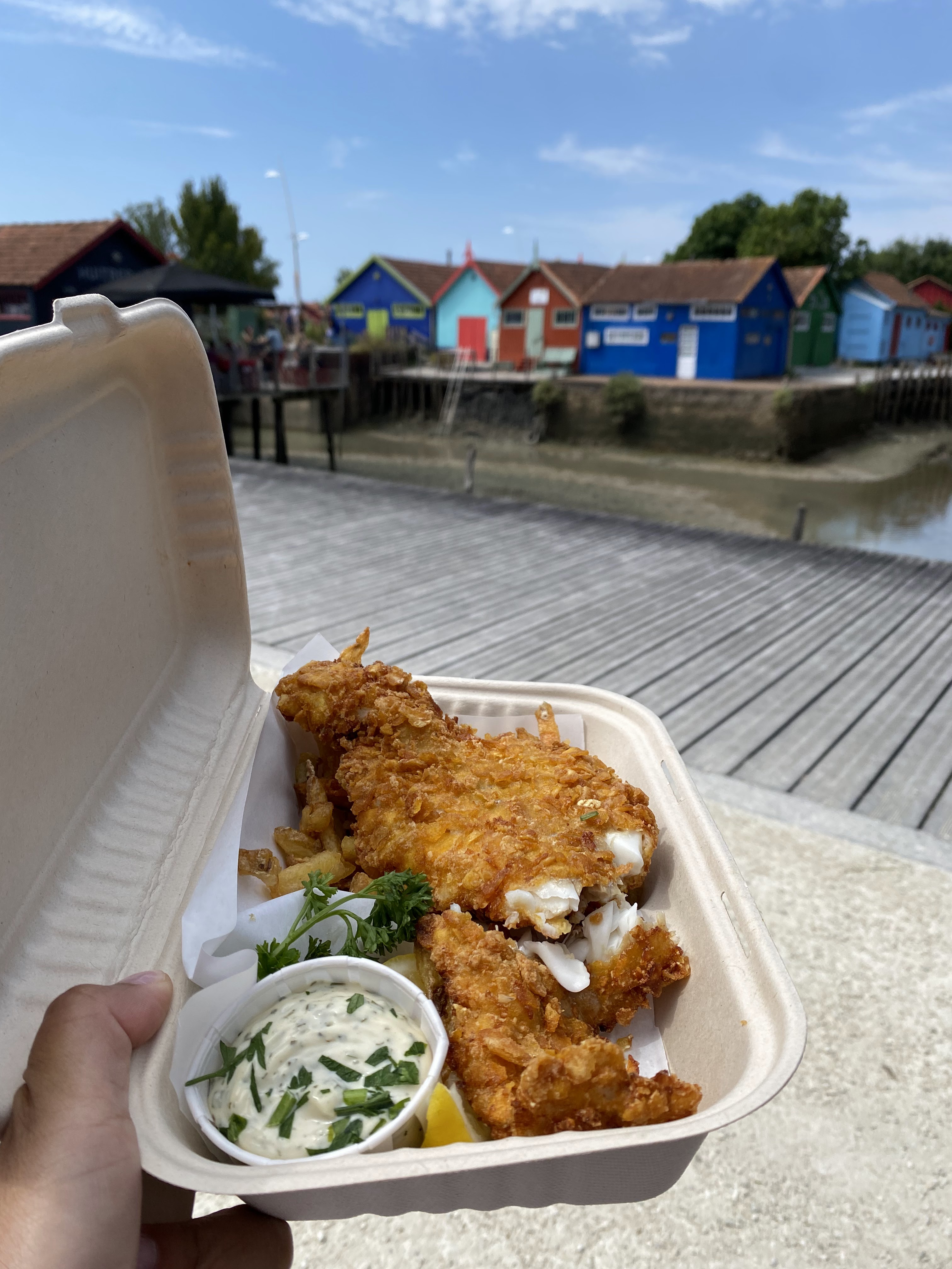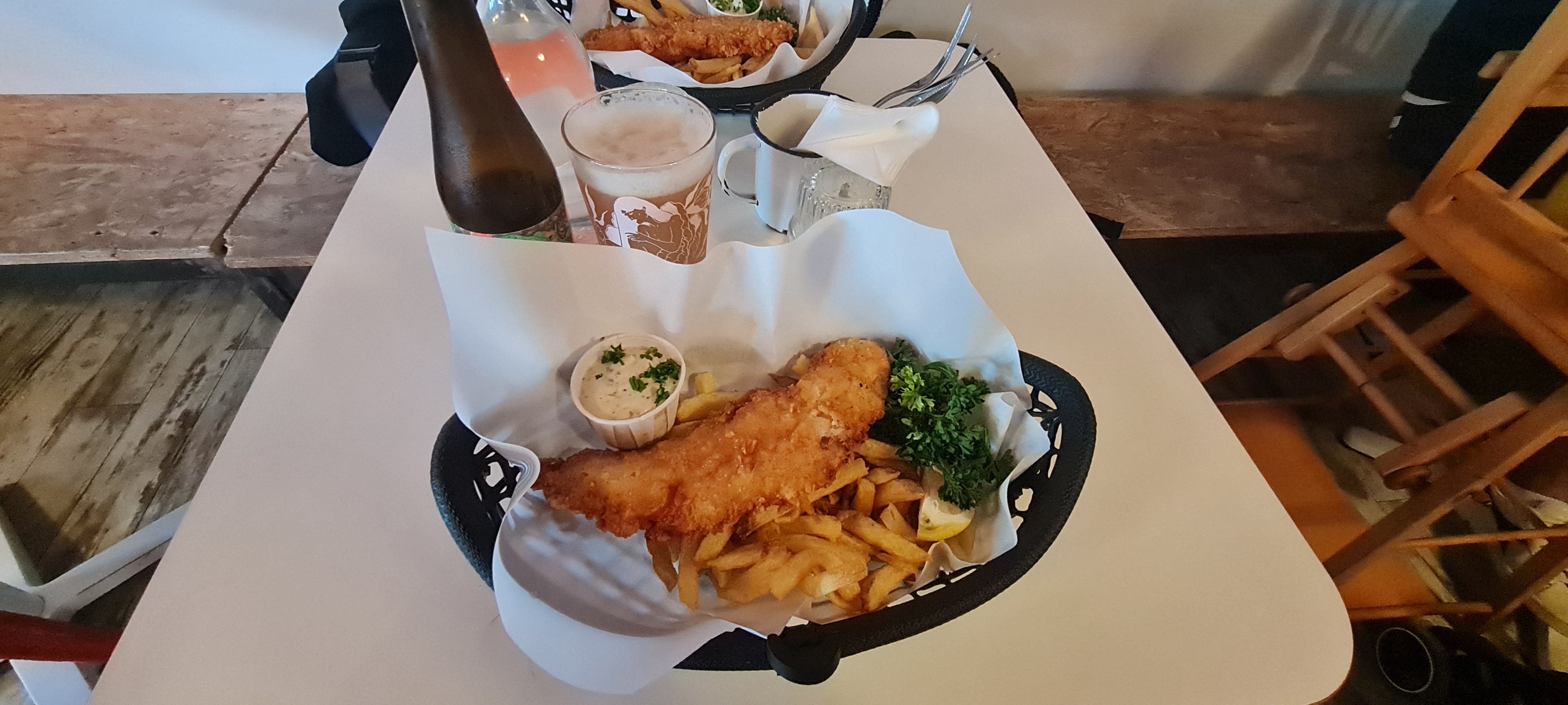 Délicieux fish and chips ! si vous voulez manger à l'intérieur je vous conseil de réserver. Nous avons pris à emporté et mangé le long des cabanes colorées c'était aussi bien :) On peut choisir sa panure et les sauces sont maison ! Un régale.