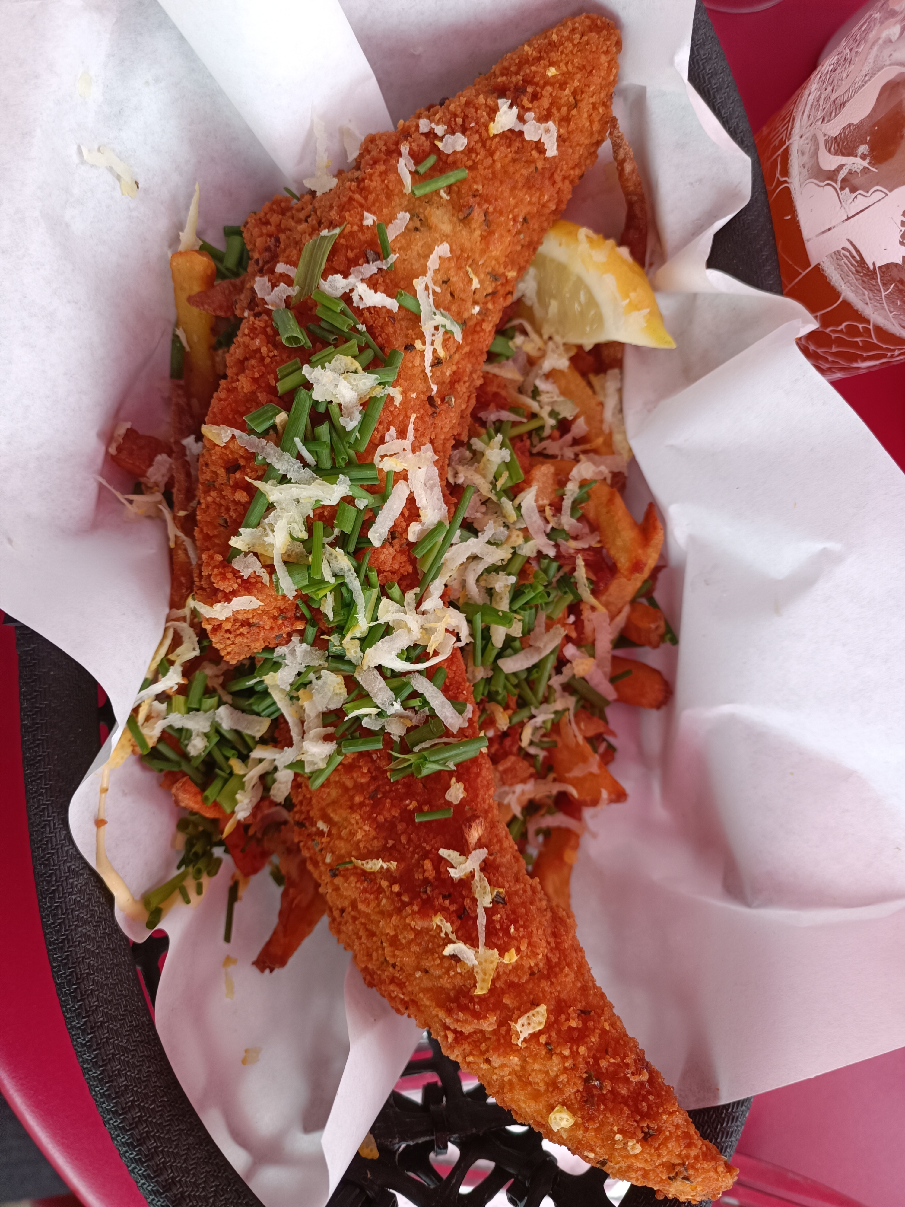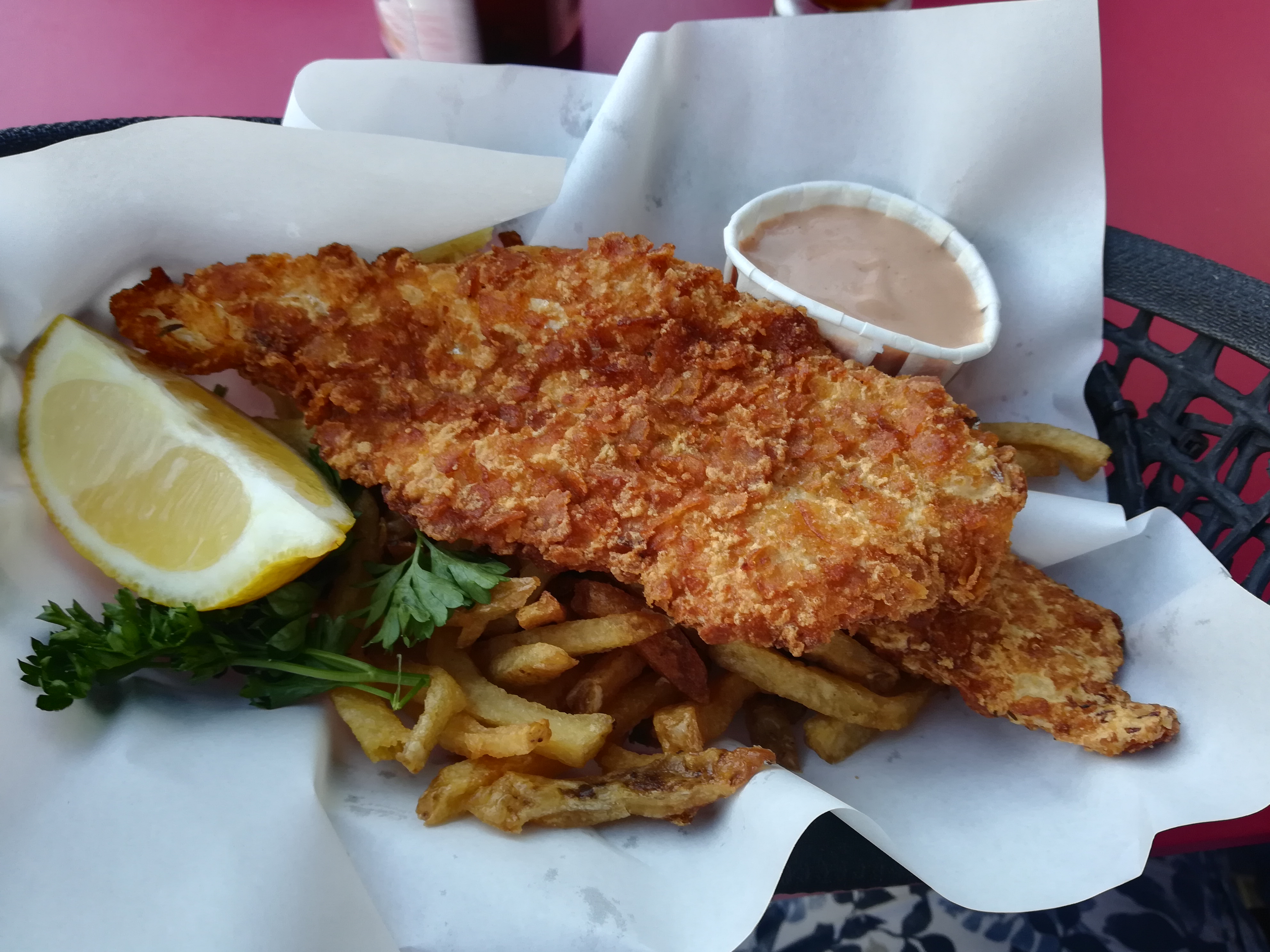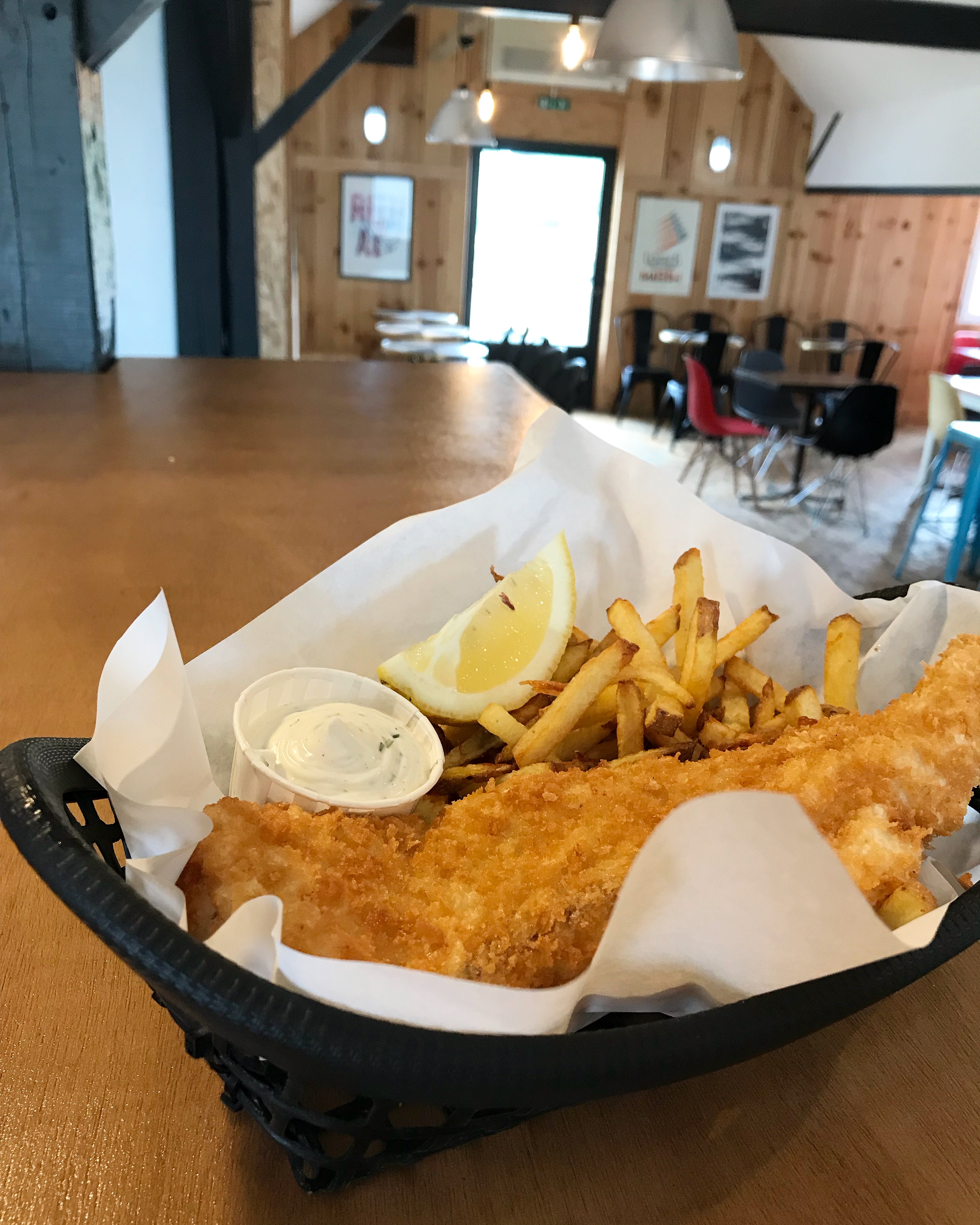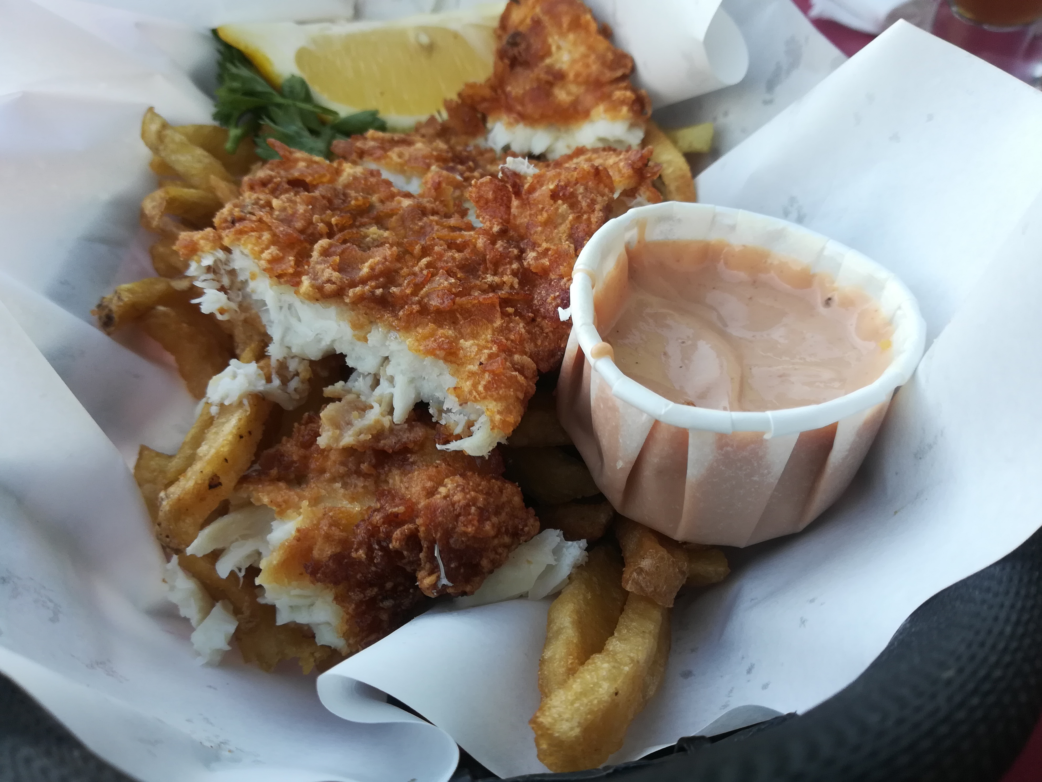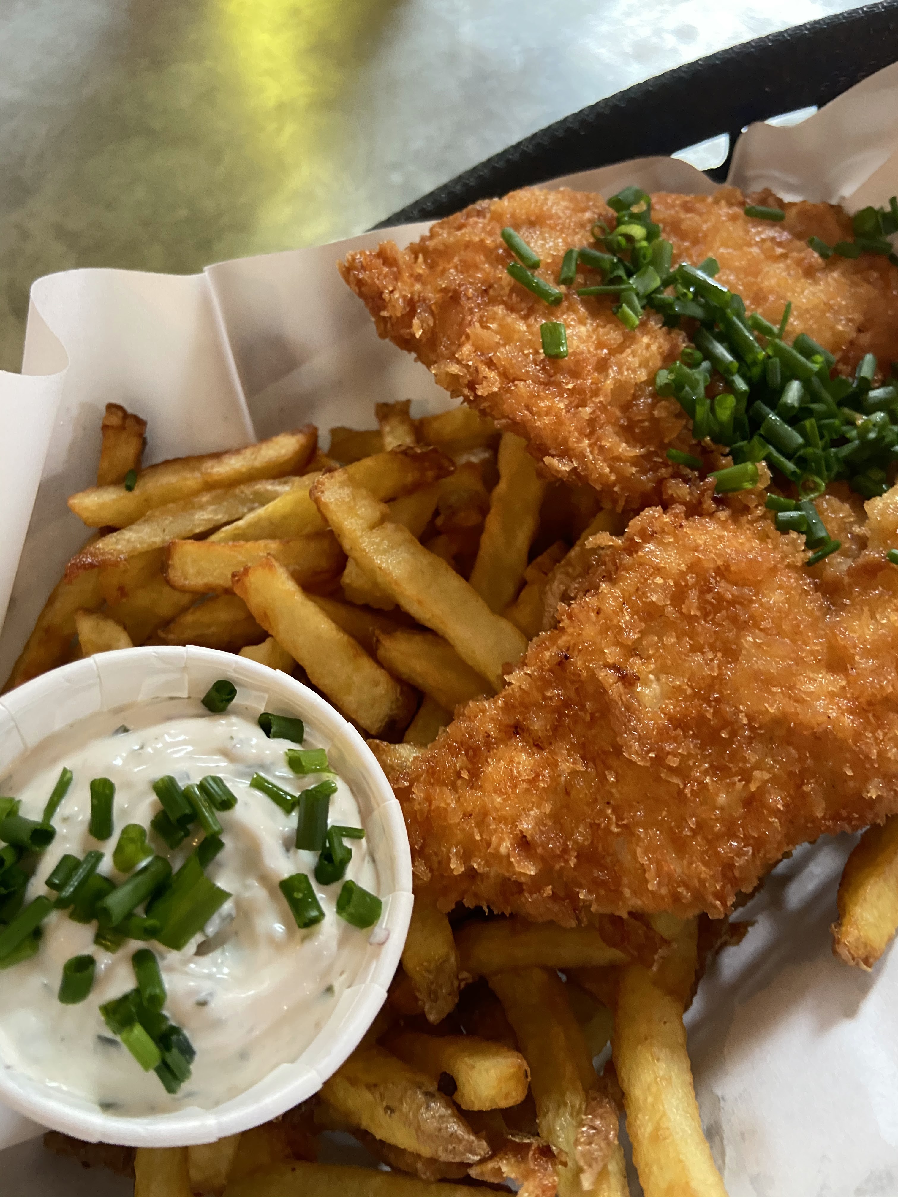 Délicieux fish and chips ! si vous voulez manger à l'intérieur je vous conseil de réserver. Nous avons pris à emporté et mangé le long des cabanes colorées c'était aussi bien :) On peut choisir sa panure et les sauces sont maison ! Un régale.