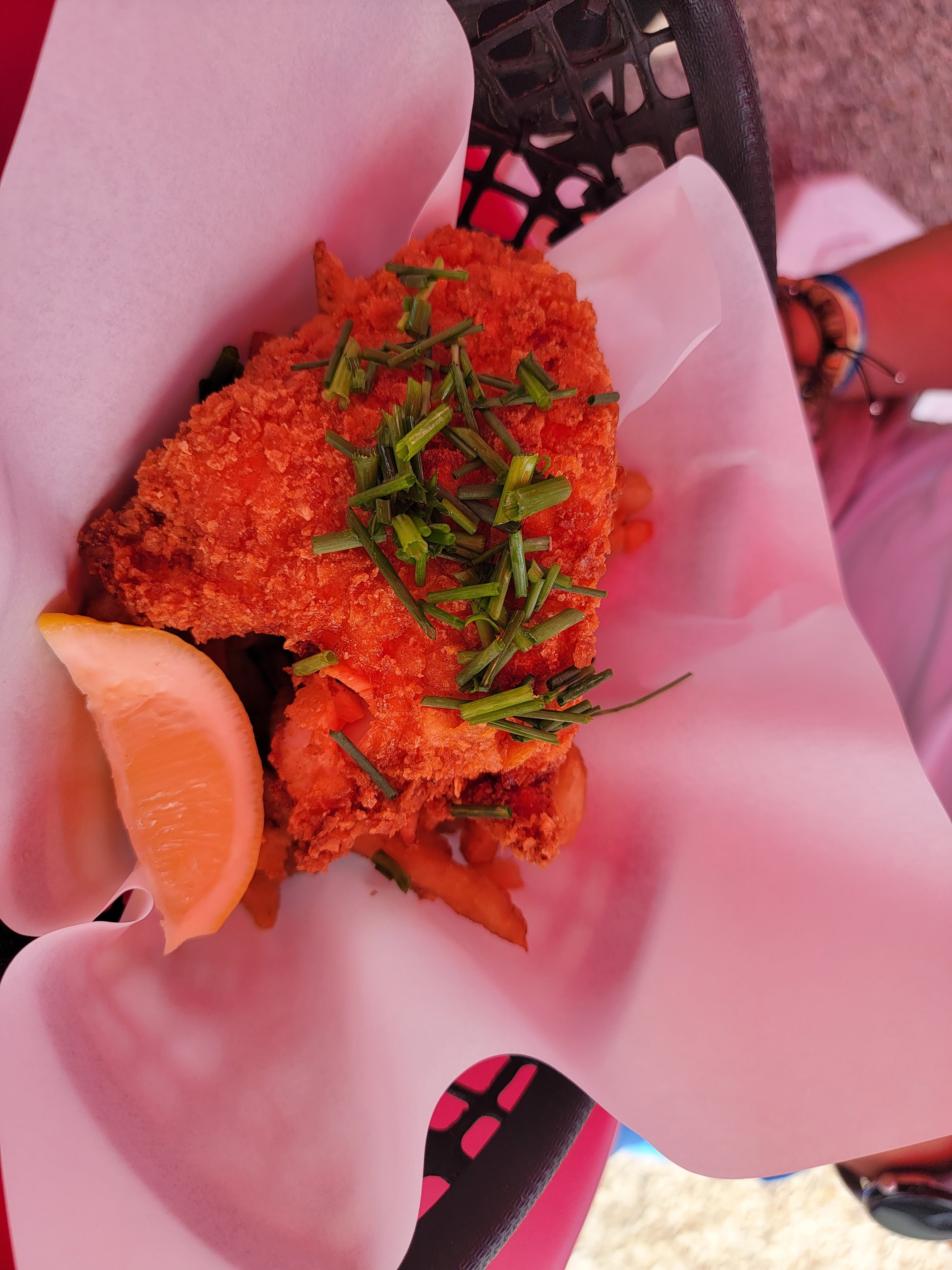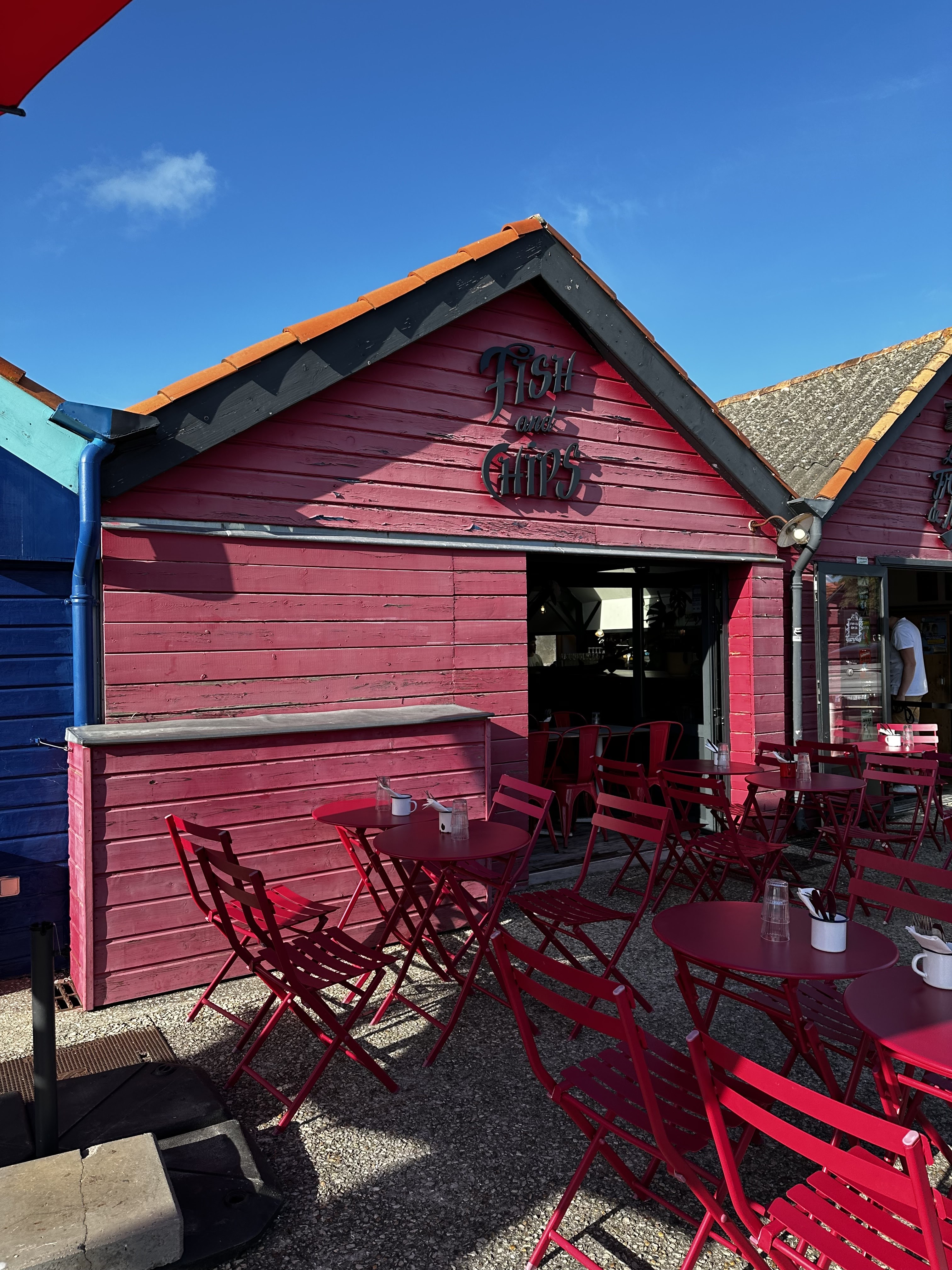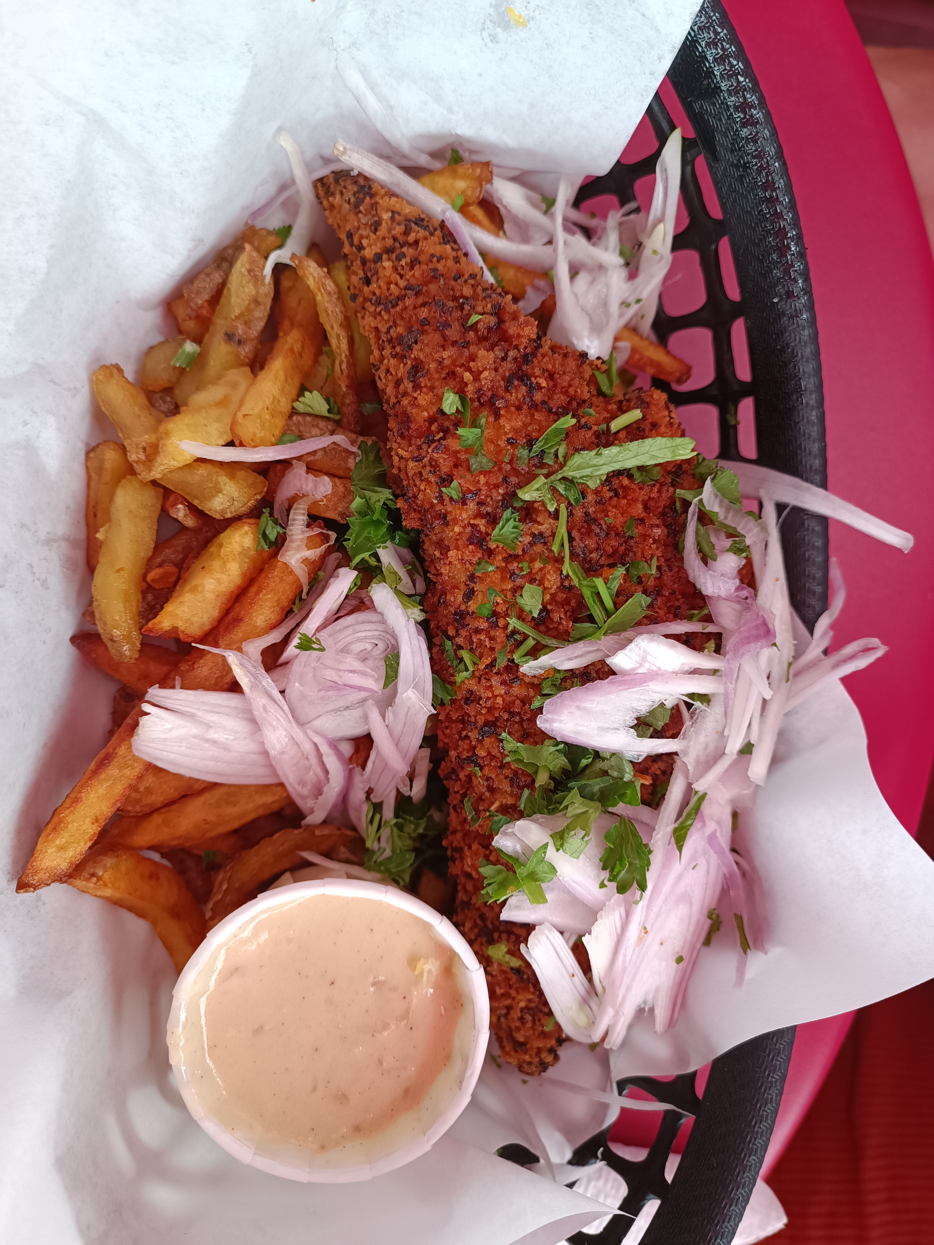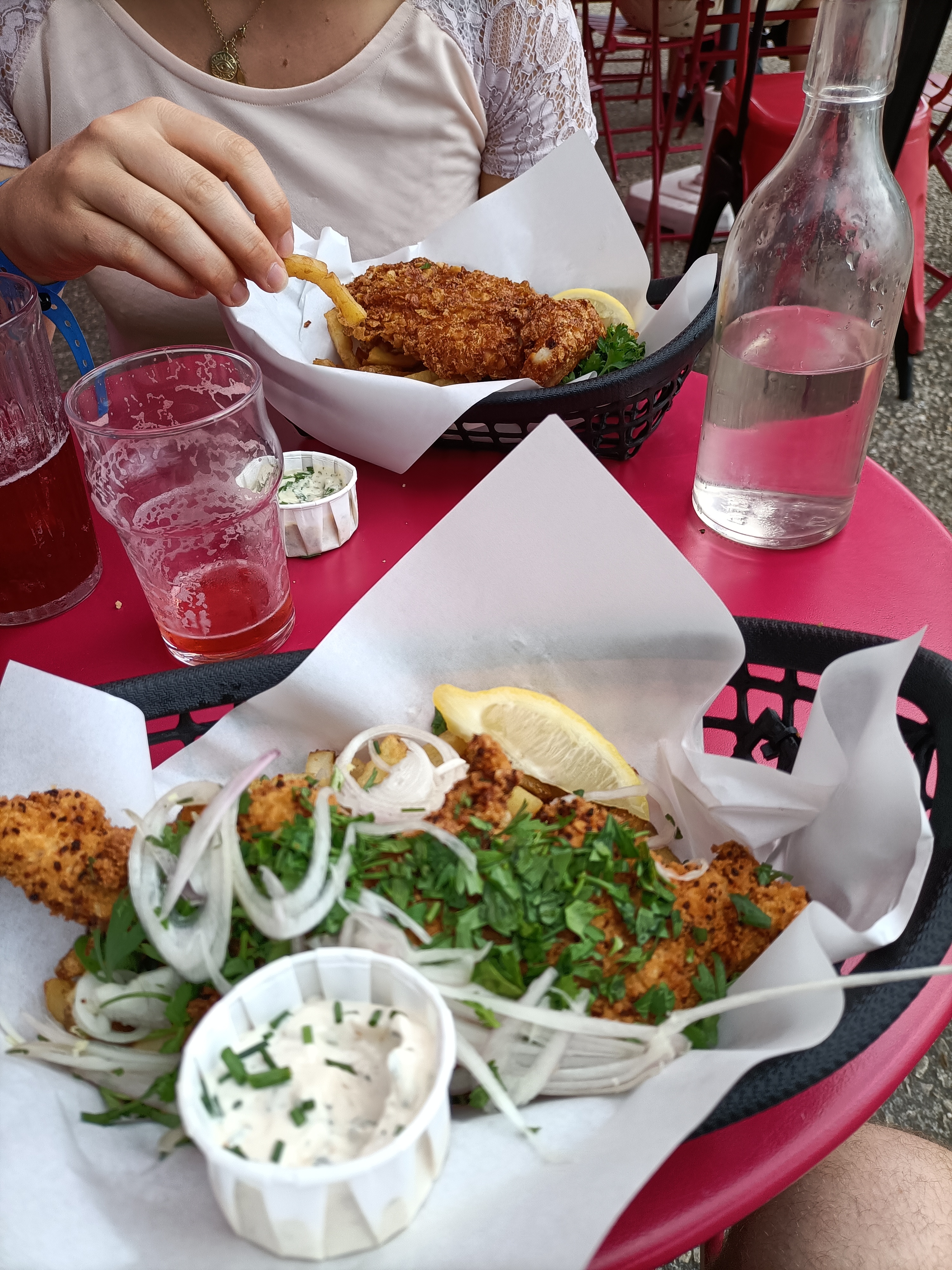 Délicieux fish and chips ! si vous voulez manger à l'intérieur je vous conseil de réserver. Nous avons pris à emporté et mangé le long des cabanes colorées c'était aussi bien :) On peut choisir sa panure et les sauces sont maison ! Un régale.