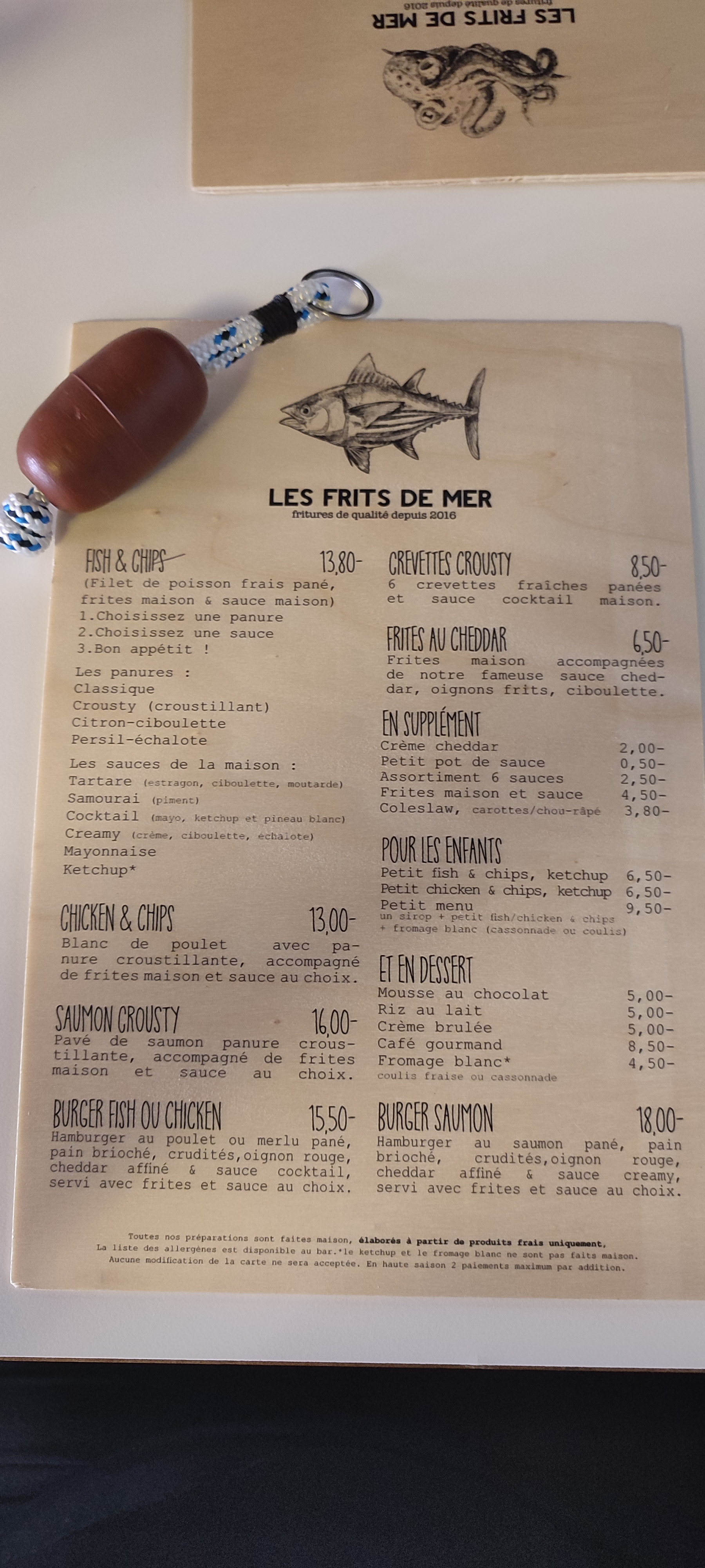 Excellent fish & chips , les rations sont raisonnables, tout fait maison et les poissons sont très bien cuit ! J'ai pris un fish à la panure crousty qui est bien copieuse et la sauce cocktail très bonne aussi ! Et la vu a deux mètre du port et du fort y joue aussi ! Très bonne adresse ! PS: mon âme de gourmand aurait quand même réclamer un petit deuxième poisson mais c'est largement suffisant