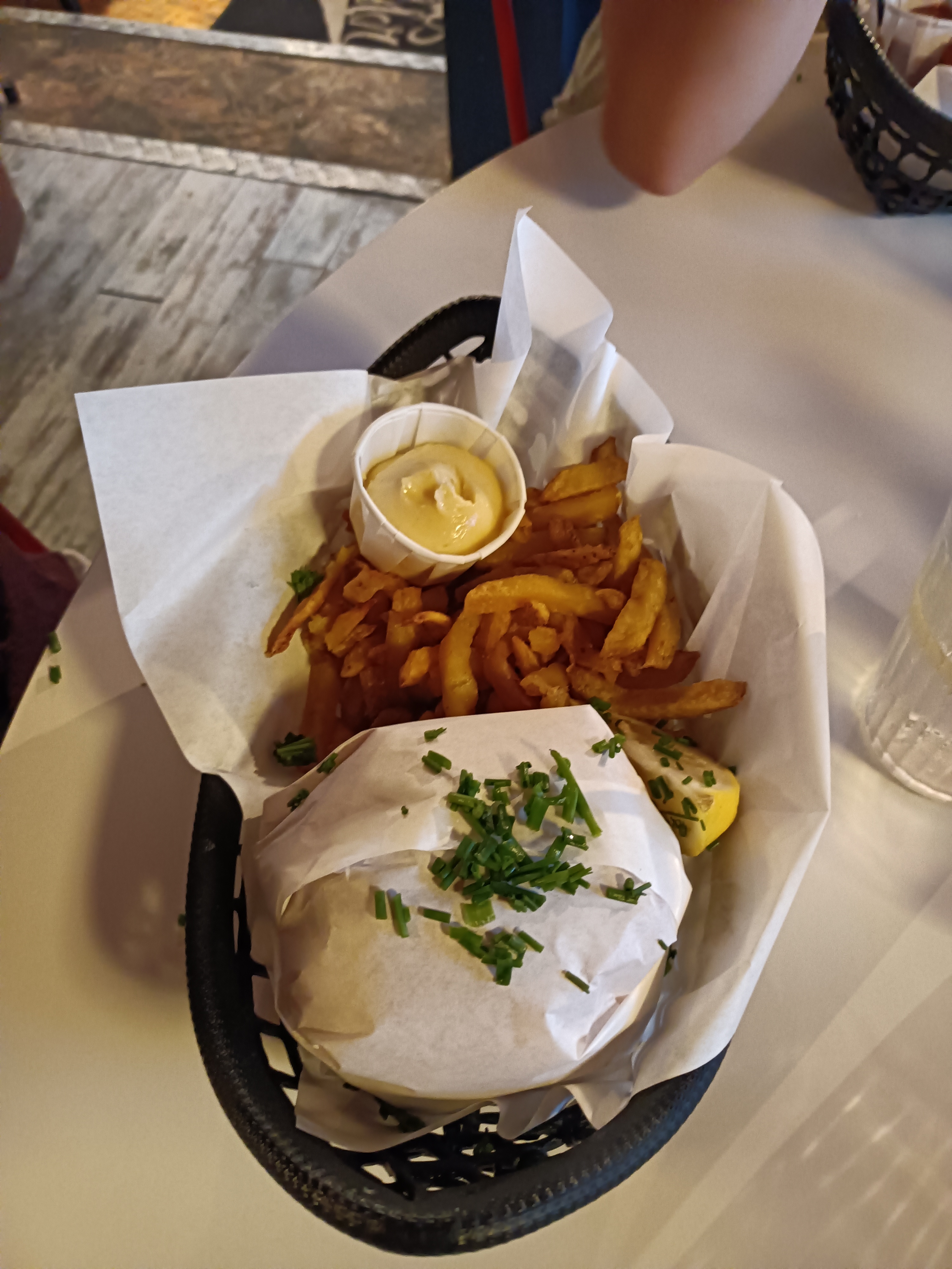 Très bon rapport qualité prix. Tout est fait maison et carte réduite. Les fish & chips : poisson pané excellent mais déçue par les frites maison trop sèches et qui ressemblaient plus à des miettes qu'à des frites. On a beaucoup apprécié de pouvoir choisir la panure et la sauce et les quantités sont généreuses. Les tables rondes à l'intérieur sont trop petites pour manger, surtout pour 3 personnes. L'accueil est souriant et agréable.