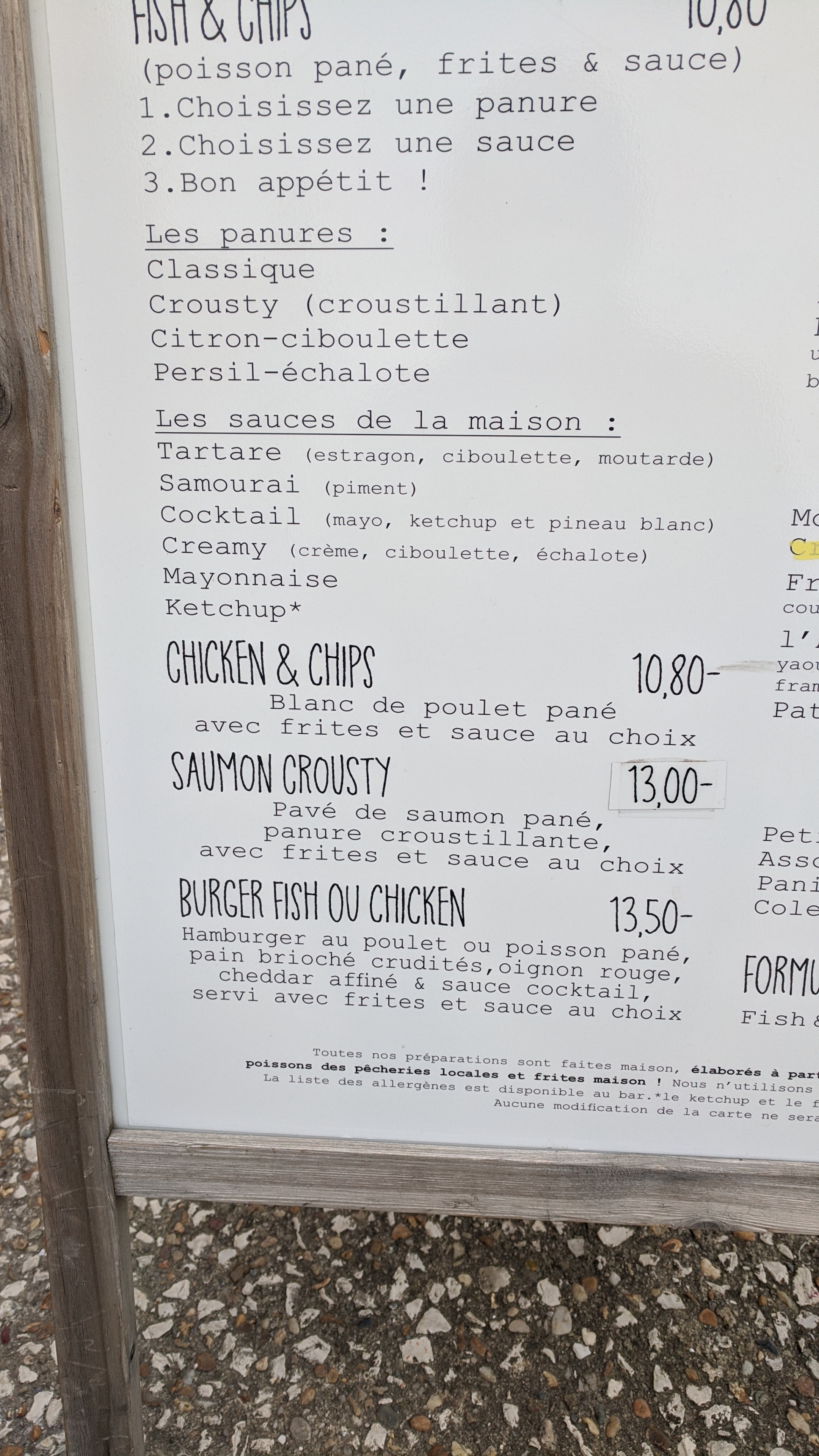 Le fish and chips est un régal, plusieurs sortes de panure et de sauce, le chicken chips très bon également. De bons desserts faits maison. Accueil très sympathique et chaleureux. On y vient à chaque vacance sur l'île.