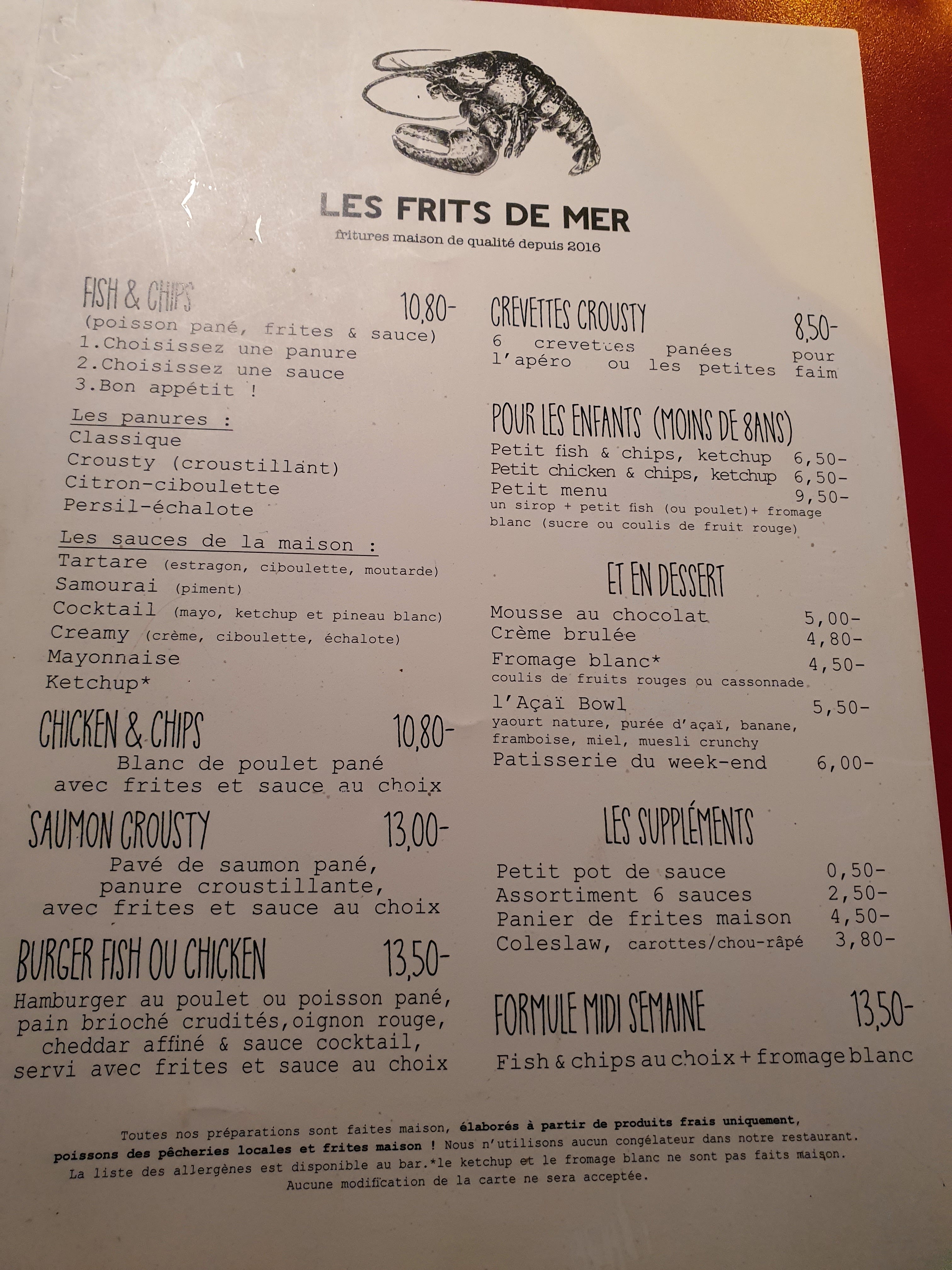 Fish and chips excellent ! Réservation conseillée. Pas fait pour y rester des heures. On mange, on paie, on part. Si on prevoit d'y passer le temps que l'on accorde aux resto rapide, on n'est pas déçu.. chouette moment en famille.