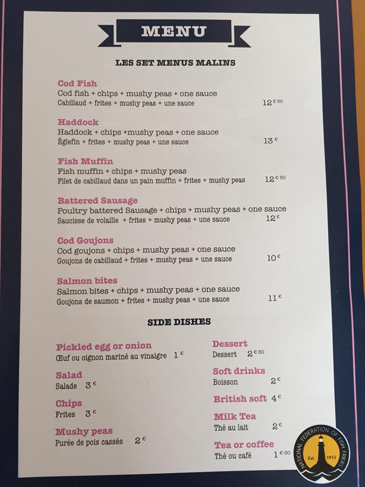 Carte très complète, cod fish, haddock shrimps et bien sûr le fromage halloumi qui permet aux végétariens de goûter cette panure si légère et croustillante comme en Angleterre ! Sourire et rapide parfait pour manger sur le pouce merci !