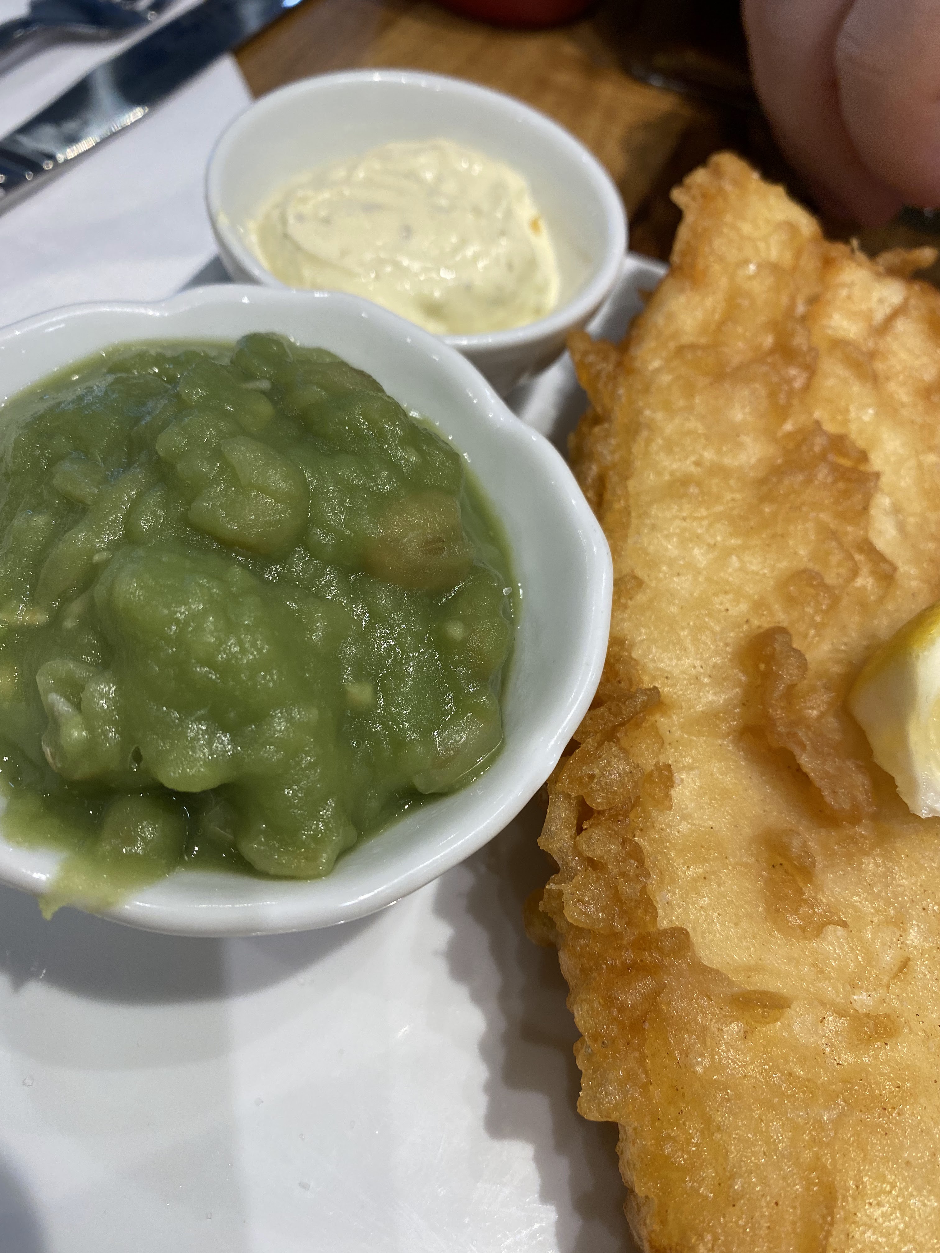 Lieu atypique et authentique, fish and chips au top et purée de pois juste délicieuse. Mon péché mignon !