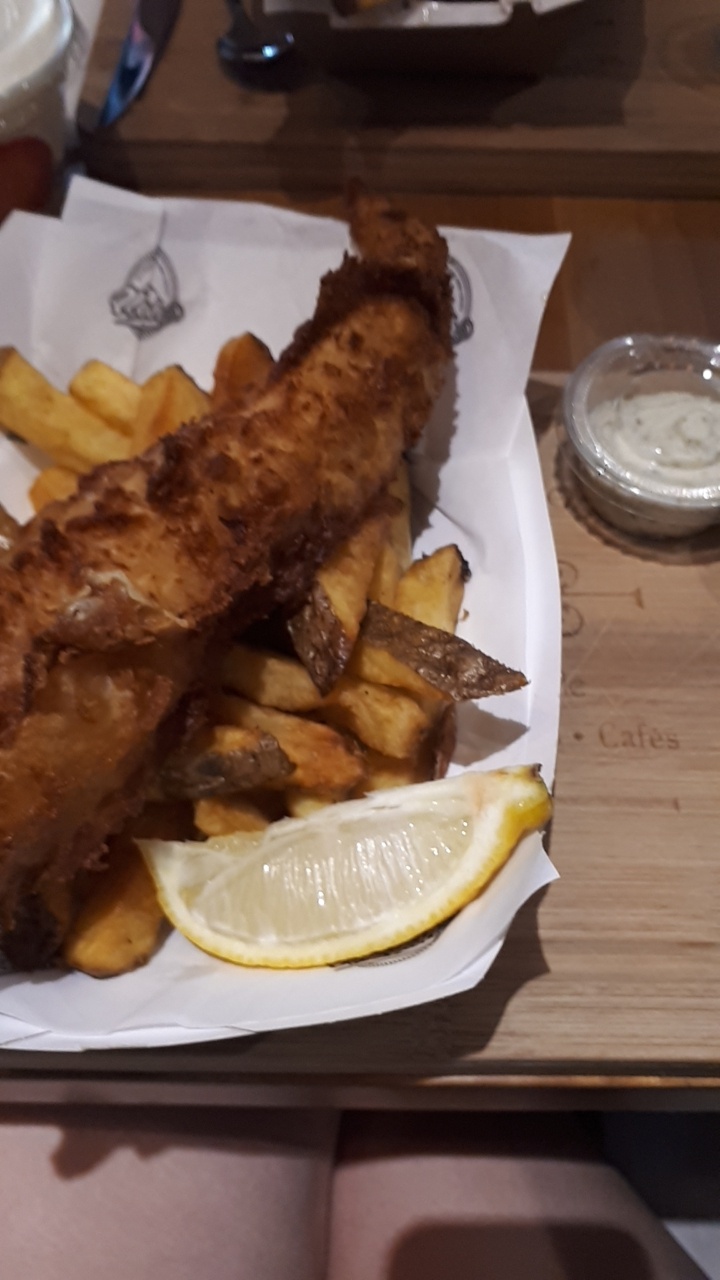 Nous sommes venues manger avec ma mère ce midi. Nous qui adorons londres et leurs fish & chips nous n avons pas été déçues du tout du plat ! Très bon. Ça nous a rappelé de bon souvenirs merci encore