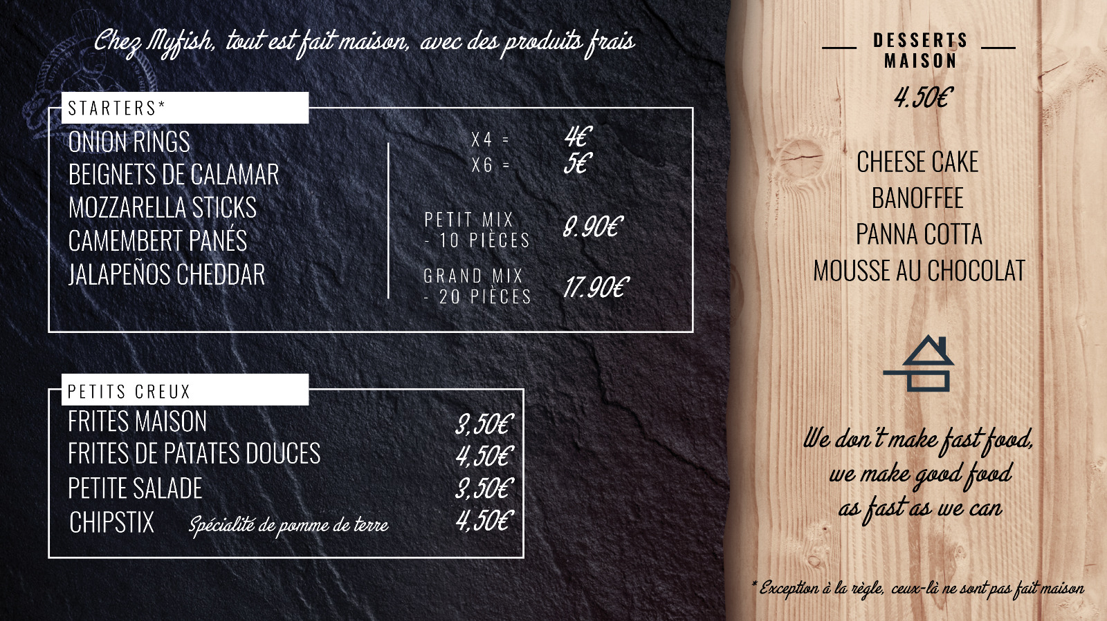 Le meilleur fish and chips de Brest (et même de France) qu'il nous ait été donné de manger. On y a nos habitudes quand bien même nous n'y allons pas souvent. Je lis dans certains commentaires que c'est cher, de notre côté on se dit surtout que l'on paye la qualité. Les desserts (faits maison) sont aussi excellents! Mon fils ne jure que par le Banofee. ❤️ Quand à l'ambiance les employés sont sympathiques et le patron est au top! Les enfants l'adorent ! Si vous voulez un fish de qualité n'hésitez pas à pousser la porte de My Fish!