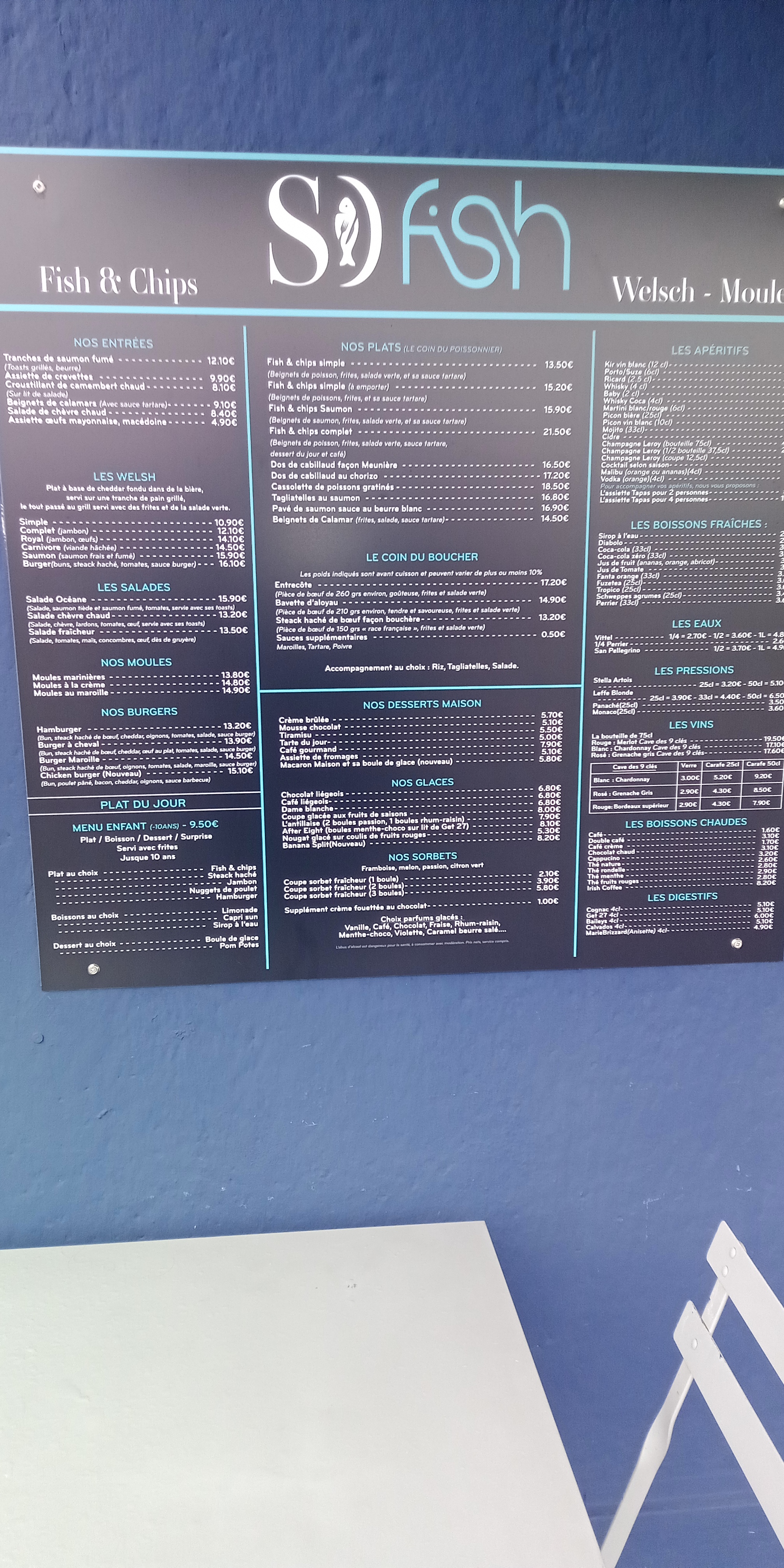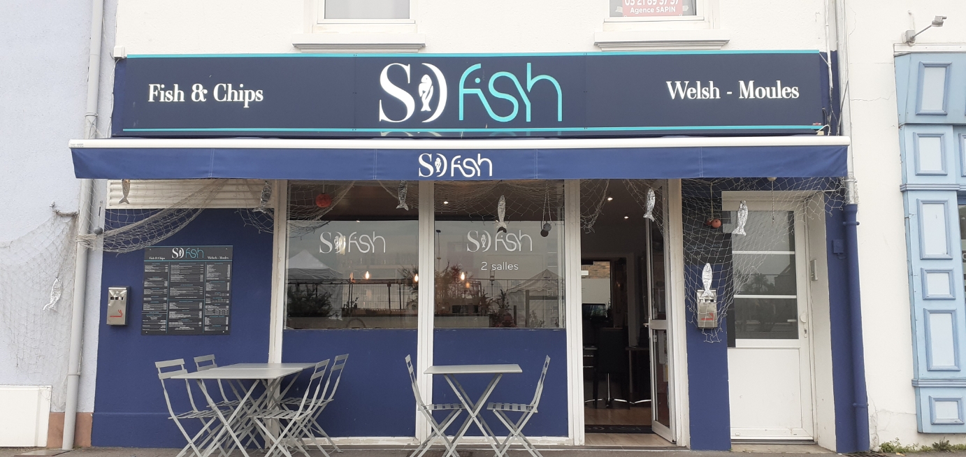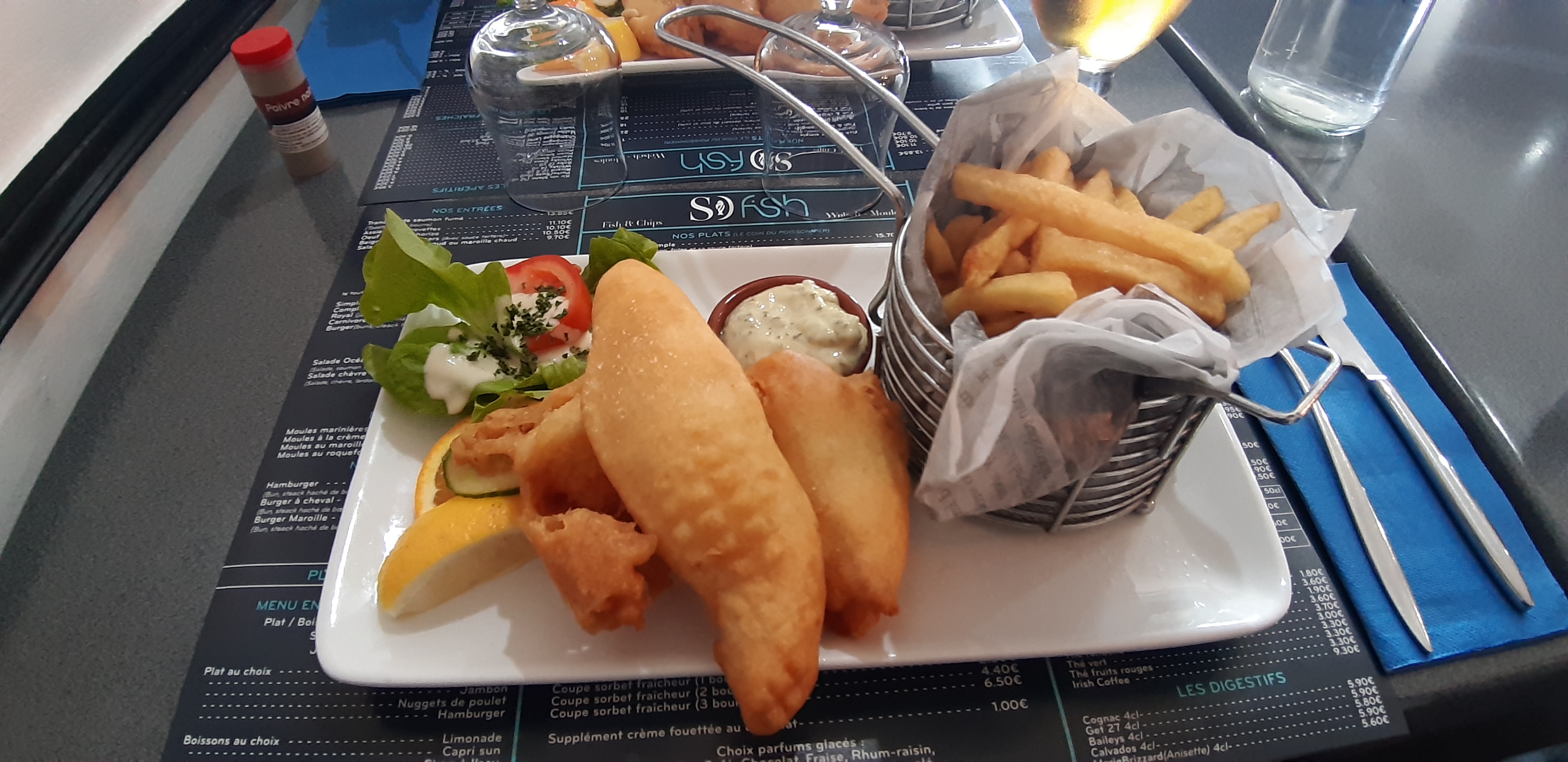 Accueil et service très sympathiques. Carte à la fois simple et suffisamment variée pour que chacun y trouve son bonheur. Nous étions en famille. Poisson en plat du jour excellent, saumon parfaitement cuit, et un classique et néanmoins excellent Fish and chips maison ! Prix tout à fait raisonnables. Une bonne découverte qui nous a donné envie d'y revenir prochainement. Point pratique important : vaste parking juste en face. Le SoFish dispose de deux salles pas très grandes... En pleine saison, peut être est-il prudent de réserver ? Mérite d'être découvert.