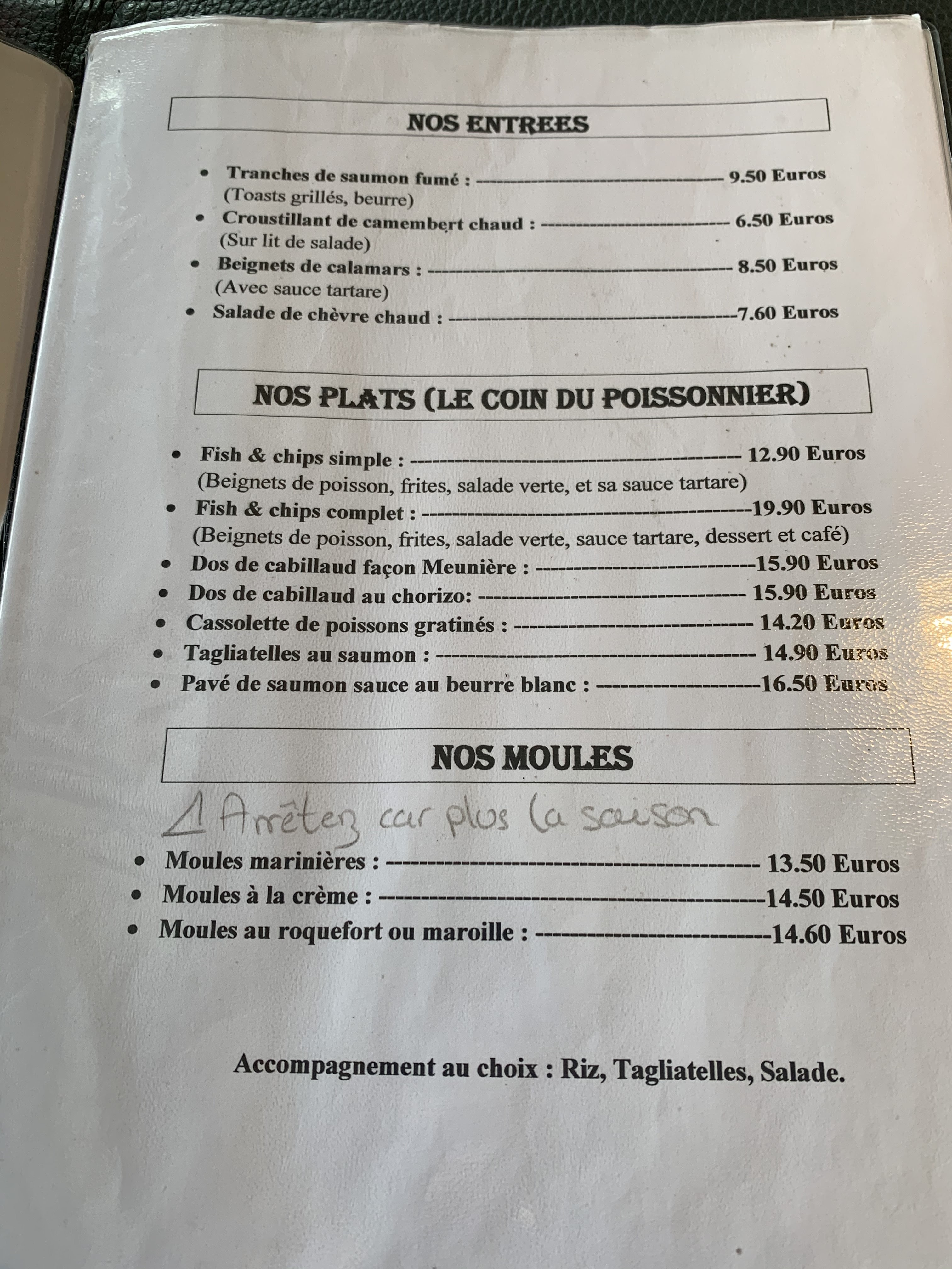 Une bonne petite adresse que je retiendrais LES moules à la crème était très bonne et le fish and chips. Très bon accueil ! Je recommande